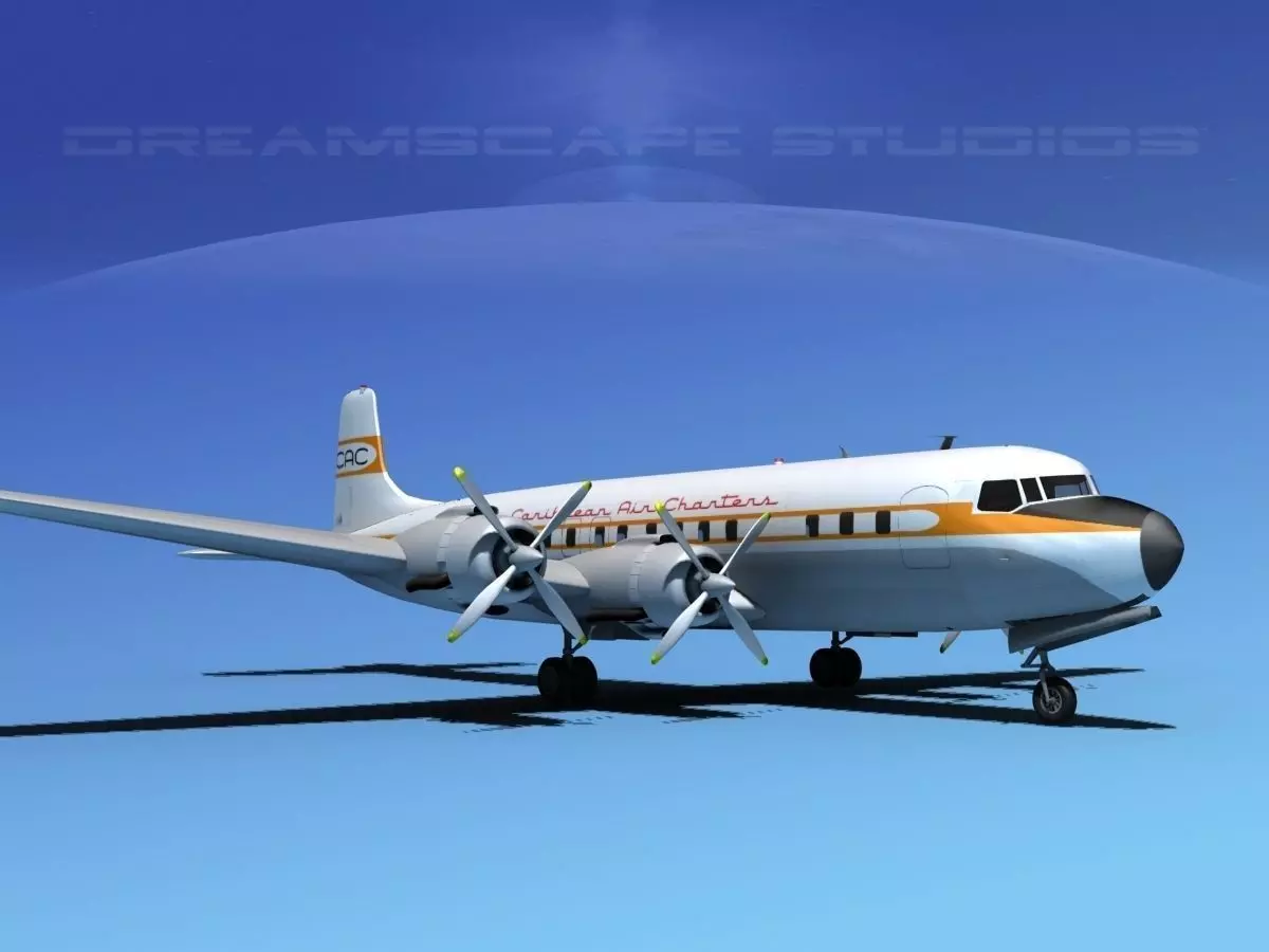 Douglas DC-7C was built near to scale by actual dimensions and in some good detail. Control surfaces are animateable including flaps, ailerons, elevators and rudder. Landing gear, landing gear doors and propellers are also animateable. A full double row radial engine is modeled in the cowlings and animateable cowling flaps are also modeled. In addition this model comes in a wide variety of formats.
