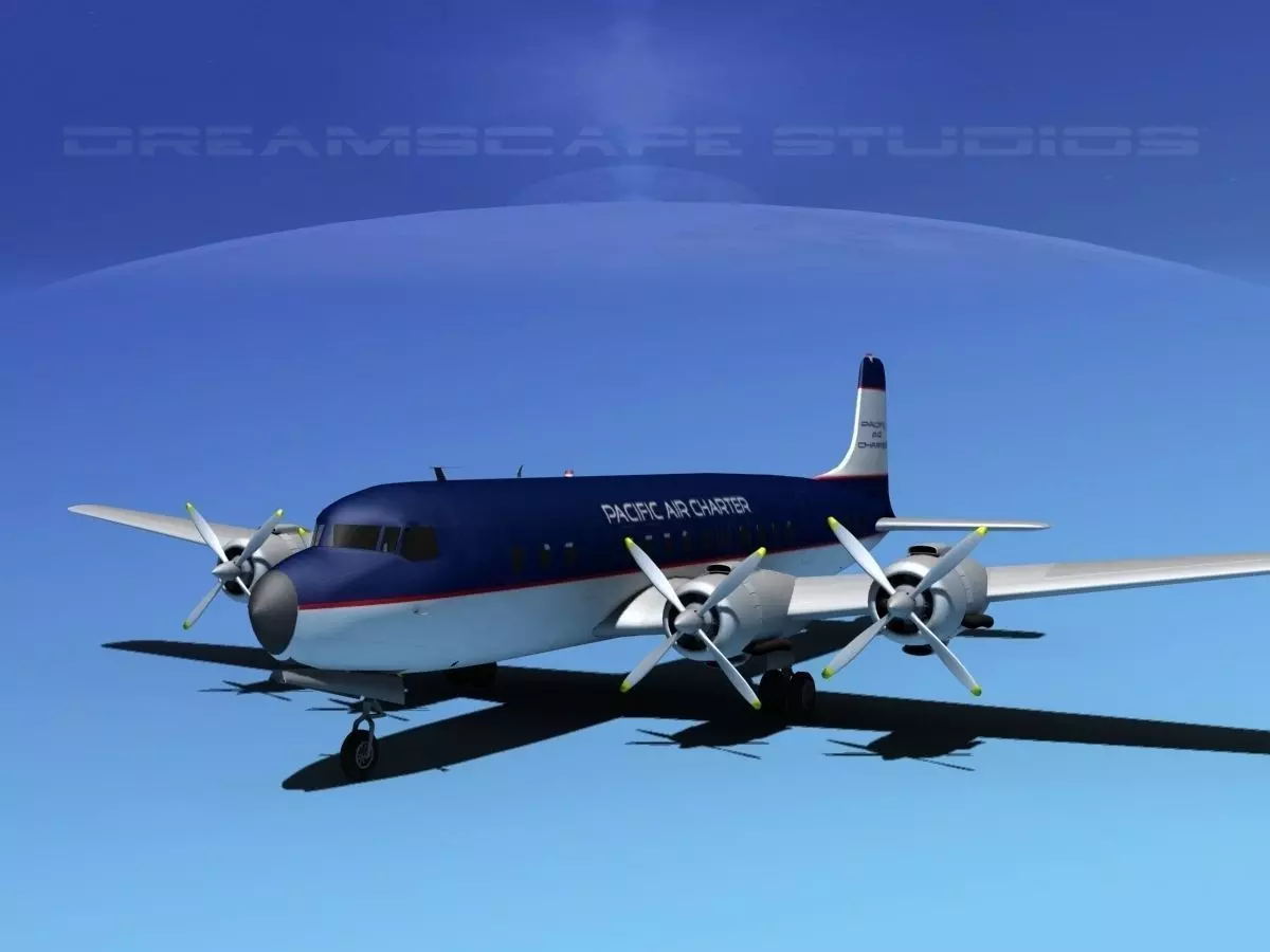 Douglas DC-7C was built near to scale by actual dimensions and in some good detail. Control surfaces are animateable including flaps, ailerons, elevators and rudder. Landing gear, landing gear doors and propellers are also animateable. A full double row radial engine is modeled in the cowlings and animateable cowling flaps are also modeled. In addition this model comes in a wide variety of formats.