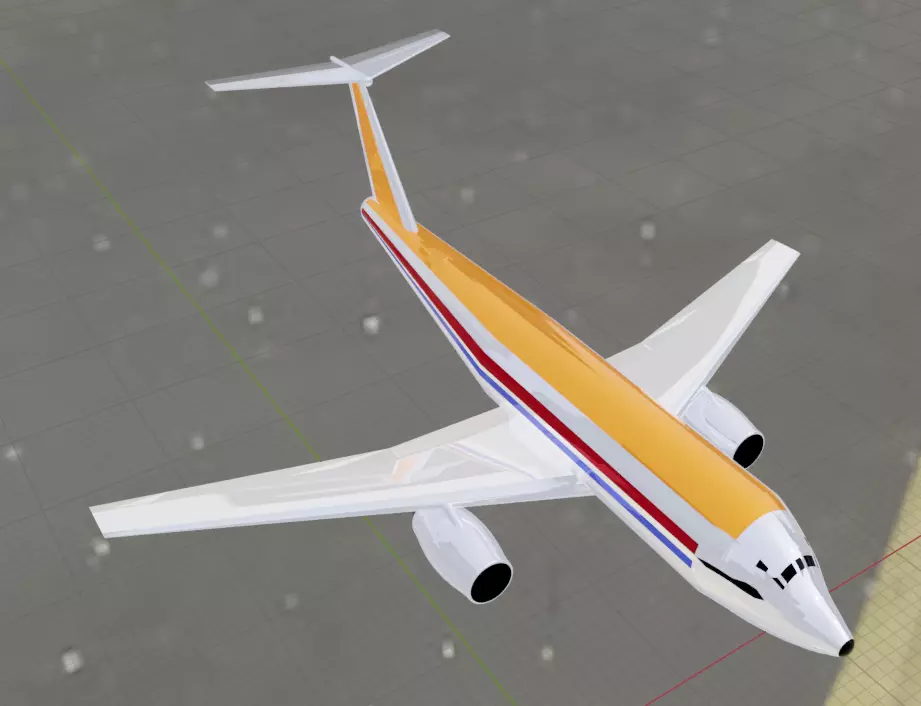 Fictional narrowbody jetliner inspired by the twin engine T-tail configuration of conceptual aircraft such as the Fokker F.29 family.