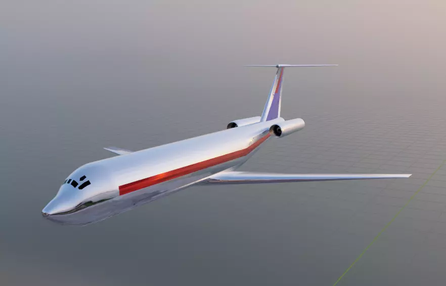 Fictional narrowbody jetliner inspired by the rear engine T-tail configuration of classic aircraft such as the DC-9-40 family.