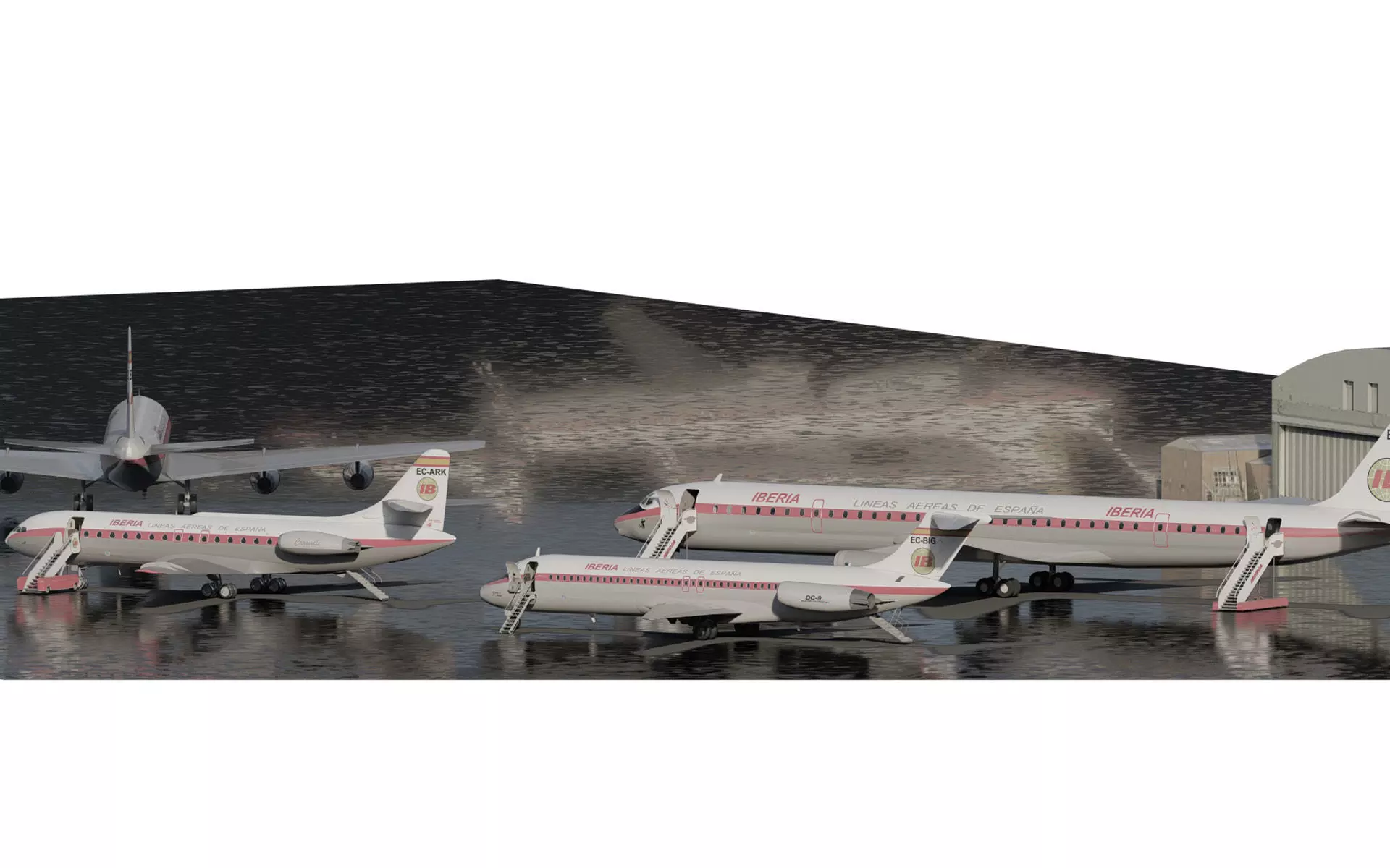 Description This is a model of the Iberia fleet from 1960s including DC-8-52 DC-8-63 and DC-9-32 and Caravelle. The 3d model is textured and iluminated for two scenes. One daylight and one with rainy scene. The model is ready to render with Lumion 12.5 or above.The package is built and designed for you to reuse, but above all, study and learn about the development of basic design stages with good 3D models and with materials, textures, camera settings, and light management that make a good balance of lighting possible.