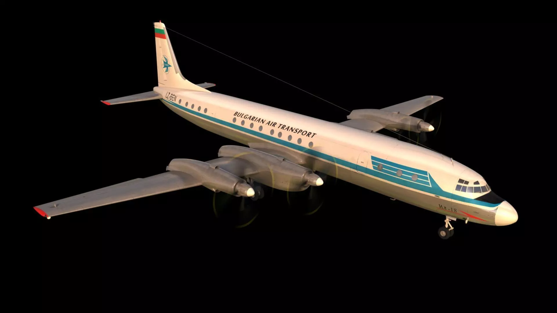 Russian turbopropeller airliner, this specific plane crashed in 1966 in Slovakia, near Bratislava. Model is for Cinema 4d, textures are mapped with flat projections, working properly only in Cinema 4d, for other 3d programs new UV maps must be created. Main parts are triangulated, there is some symetry and some subdivisions, but most of the geometry is mesh. Model have animated retracting gear, flaps, and turning of landing reflectors, and retracting of them. Lighting of samples is made by Physical sky, one ambient omni light with area shadows and Global illumination effect. Propellers are in two versions, blured for flight animation in higher RPM and solid version, for stopped engines or for lower RPM. Typical for engines starting or taxiing. Textures are in tiff format with layers and groups, easily editable in photoshop, but there are included also jpg versions.