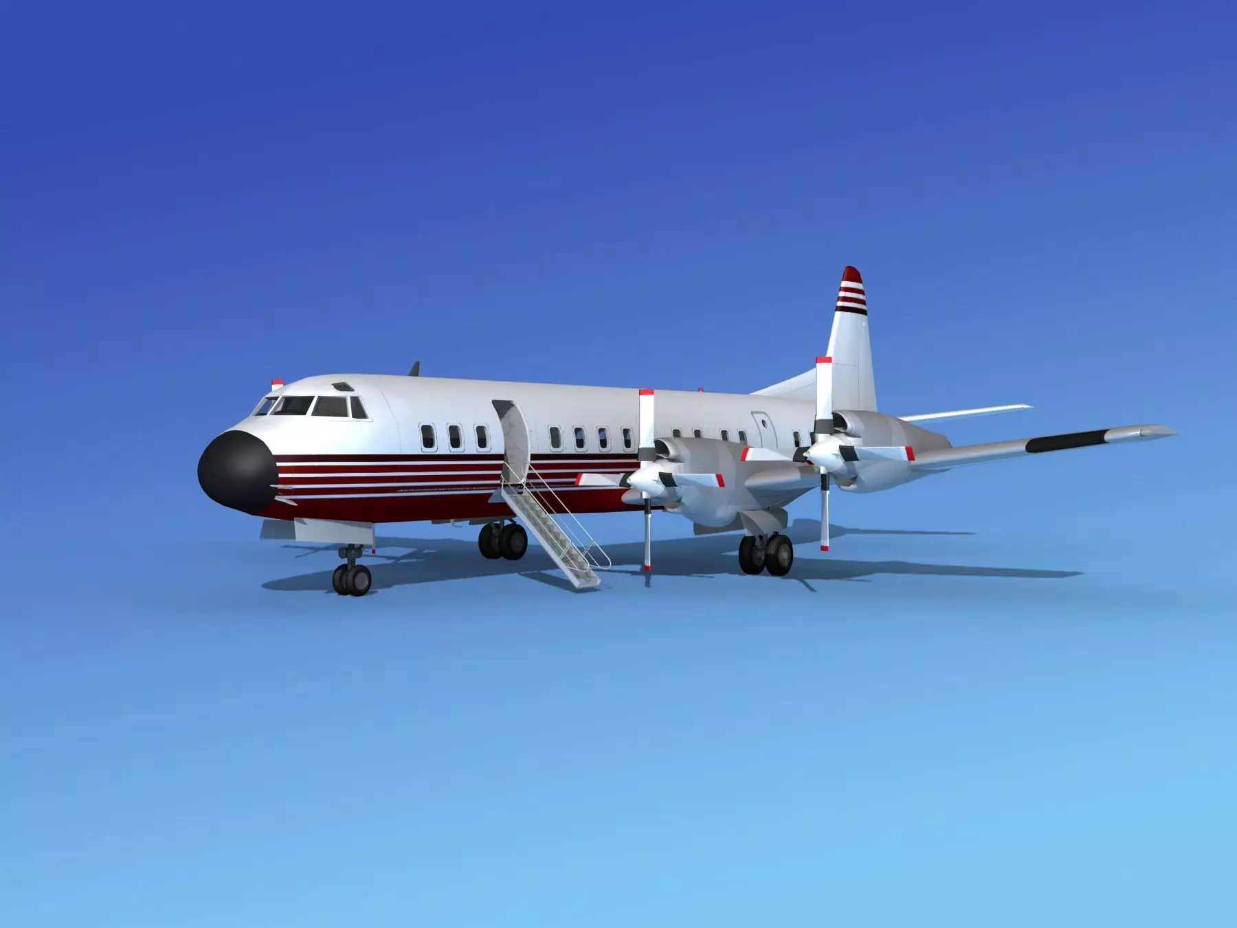 This model is built in November 2010 very near to scale and has high quality textures and materials. It comes with lots of exterior detail, animateable flaps, ailerons, rudder, elevators, and propellers. The landing gear can be retracted and landing gear doors closed. This model is a complete replacement for our earlier version of the L188 Electra. We have increased the smoothness of the faces and the poly-count, remodeled most of the aircraft from scratch, and reworked all the materials. It has interior detail including cockpit, cabin and galley. The cabin seating is a generic 66 seat arrangement. The cockpit includes the controls, instrument panels and seating as well as a flight engineers seat. Engineers panel is not detailed. Overhead panel is completed. The cabin includes the double walled fuselage, seats, with animateable drop down tables. Overhead racks are also included. Galley and lavatory bulkheads and doors are included. The interior of the model has blue seating and blue gray carpeted floor.
