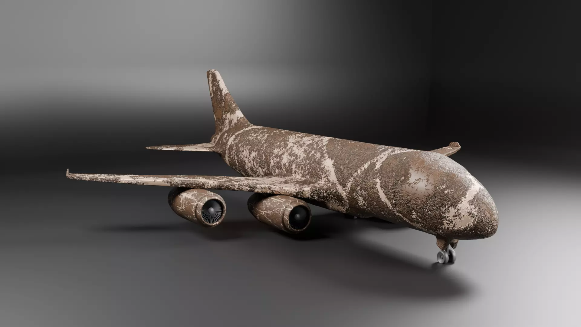 This 3D model presents a detailed, realistic rendering of a large aircraft with a worn, weathered texture resembling aged metal and corroded paint. The model captures the full structure of a commercial jet, including its engines, landing gear, and aerodynamic body. Ideal for post-apocalyptic scenes, aviation simulations, or cinematic projects, this piece stands out for its textural realism and professional execution.
