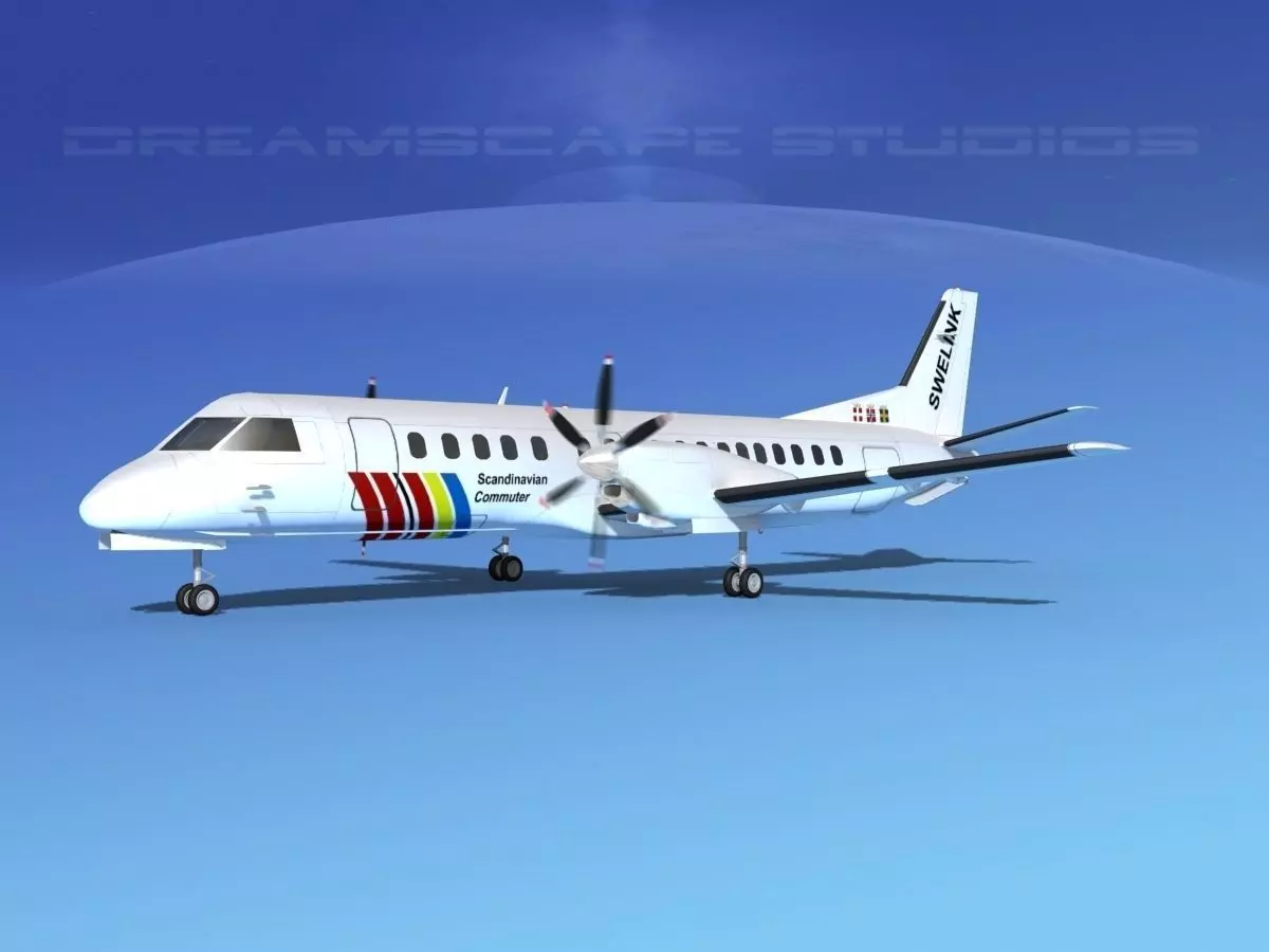 SAAB 2000 Swelink This model was originally built in Max 13 near to scale, within 3% of general dimensions. It includes a lot of exterior detail and general cockpit modeling. The model is fully textured. This model also has animateable landing gear retraction, flaps, landing gear doors, ailerons, elevators and rudder. Propellers are animated. Tires and wheels are animateable also. It is available in several formats for a wide variety of end users. This model comes with many different airlines liveries. The model is built to be used in in-flight or airport ground animations and video or simulation. It can also be used to populate an airport scene.