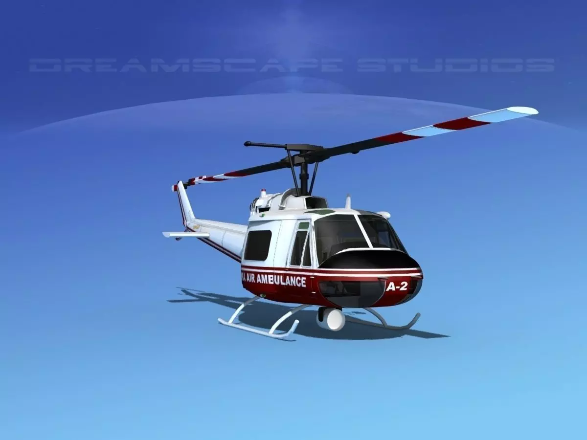 Bell 204 Alaska Air Ambulance This model was built near to scale. The model is fully textured. It comes with all materials and textures as shown. The main rotor and tail rotor are animateable. The side loading doors and crew doors can be closed and opened to reveal some good detail in the cabin and cockpit. The pilot and copilots seats include the armor and controls. The instrument panel is view-able from outside of the model. The rotors are somewhat detailed. The cabin includes the military light seats. These models come in several formats for immediate downloading.
