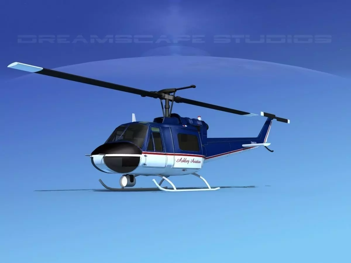 Bell 204 Ashley Aviation This model was built near to scale. The model is fully textured. It comes with all materials and textures as shown. The main rotor and tail rotor are animateable. The side loading doors and crew doors can be closed and opened to reveal some good detail in the cabin and cockpit. The pilot and copilots seats include the armor and controls. The instrument panel is viewable from outside of the model. The rotors are somewhat detailed. The cabin includes the military light seats. These models come in several formats for immediate downloading.