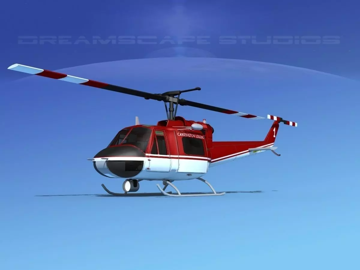 Bell 204 Carington Logging This model was built near to scale. The model is fully textured. It comes with all materials and textures as shown. The main rotor and tail rotor are animateable. The side loading doors and crew doors can be closed and opened to reveal some good detail in the cabin and cockpit. The pilot and copilots seats include the armor and controls. The instrument panel is viewable from outside of the model. The rotors are somewhat detailed. The cabin includes the military light seats. These models come in several formats for immediate downloading.