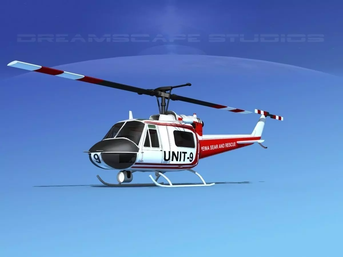 Bell 204 Chippewa Rescue This model was built near to scale. The model is fully textured. It comes with all materials and textures as shown. The main rotor and tail rotor are animateable. The side loading doors and crew doors can be closed and opened to reveal some good detail in the cabin and cockpit. The pilot and copilots seats include the armor and controls. The instrument panel is viewable from outside of the model. The rotors are somewhat detailed. The cabin includes the military light seats. These models come in several formats for immediate downloading.