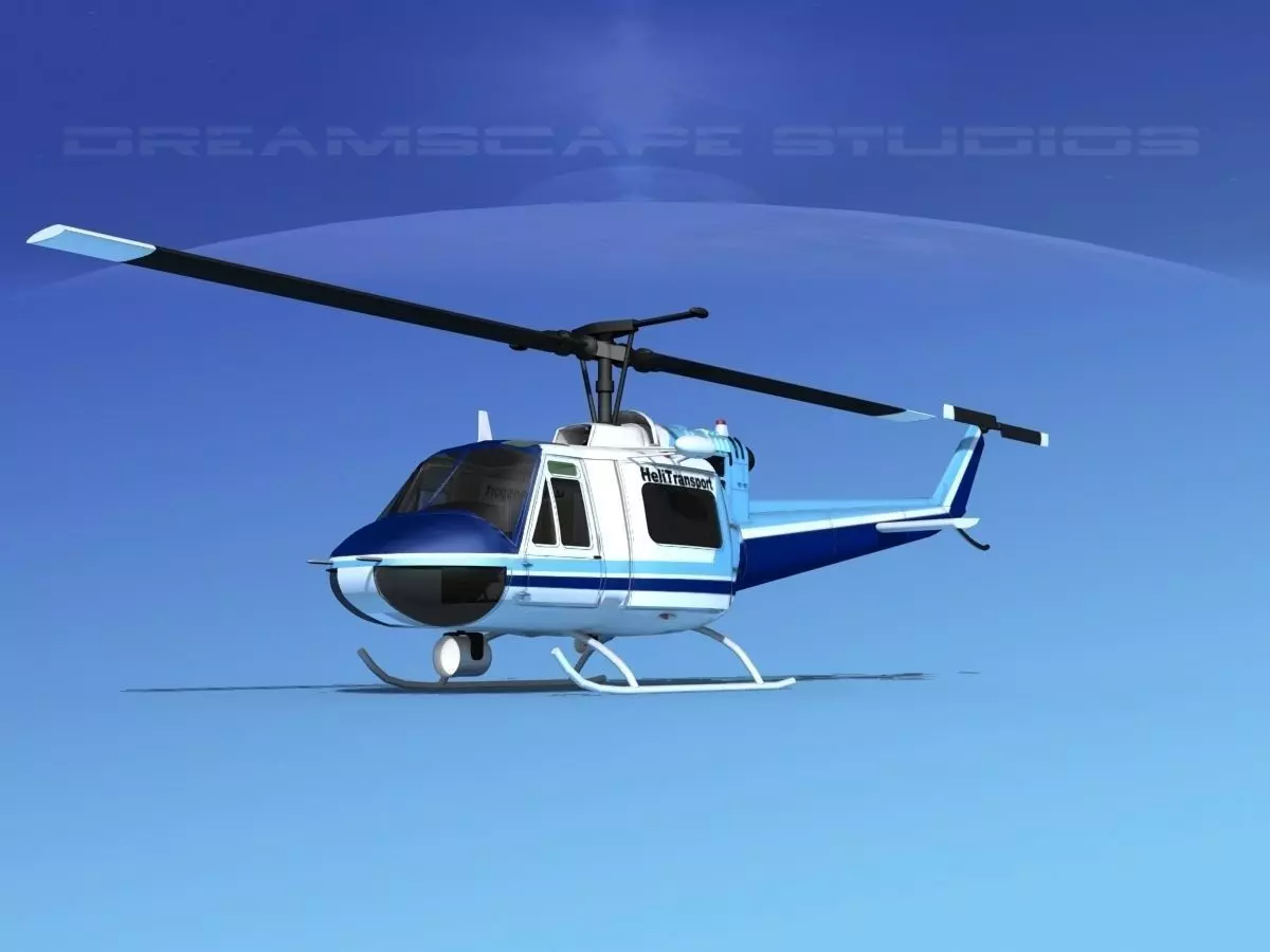 Bell 204 Corporate This model was built near to scale. The model is fully textured. It comes with all materials and textures as shown. The main rotor and tail rotor are animateable. The side loading doors and crew doors can be closed and opened to reveal some good detail in the cabin and cockpit. The pilot and copilots seats include the armor and controls. The instrument panel is viewable from outside of the model. The rotors are somewhat detailed. The cabin includes the military light seats. These models come in several formats for immediate downloading.