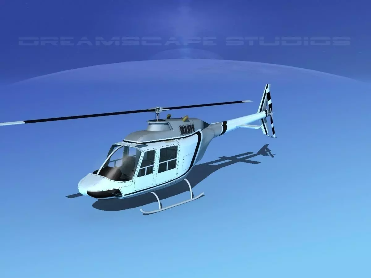 Bell 206 JetRanger V01 This model was originally built in Max 13 near to scale (within 3-4% of scale) and fully textured. It comes with all the materials and textures shown in renderings here. It is available in several formats for a wide variety of end users. This model comes with many different liveries. It is built to be used in in-flight or airport ground animations and video or simulation. It can also be used to populate an airport scene. The model has animated rotor and tail-rotor. The cockpit is semi detailed including control yoke, cyclic, rudder pedals, seating and instrument panel.