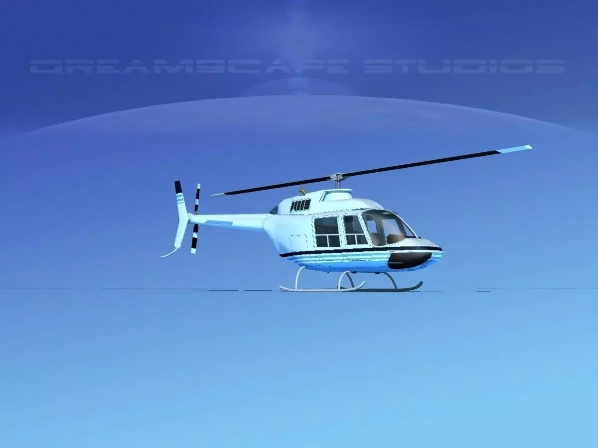 Bell 206 Jet Ranger V08 This model was originally built in Max 13 near to scale (within 3-4% of scale) and fully textured. It comes with all the materials and textures shown in renderings here. It is available in several formats for a wide variety of end users. This model comes with many different liveries. It is built to be used in in-flight or airport ground animations and video or simulation. It can also be used to populate an airport scene. The model has animated rotor and tail-rotor. The cockpit is semi detailed including control yoke, cyclic, rudder pedals, seating and instrument panel.