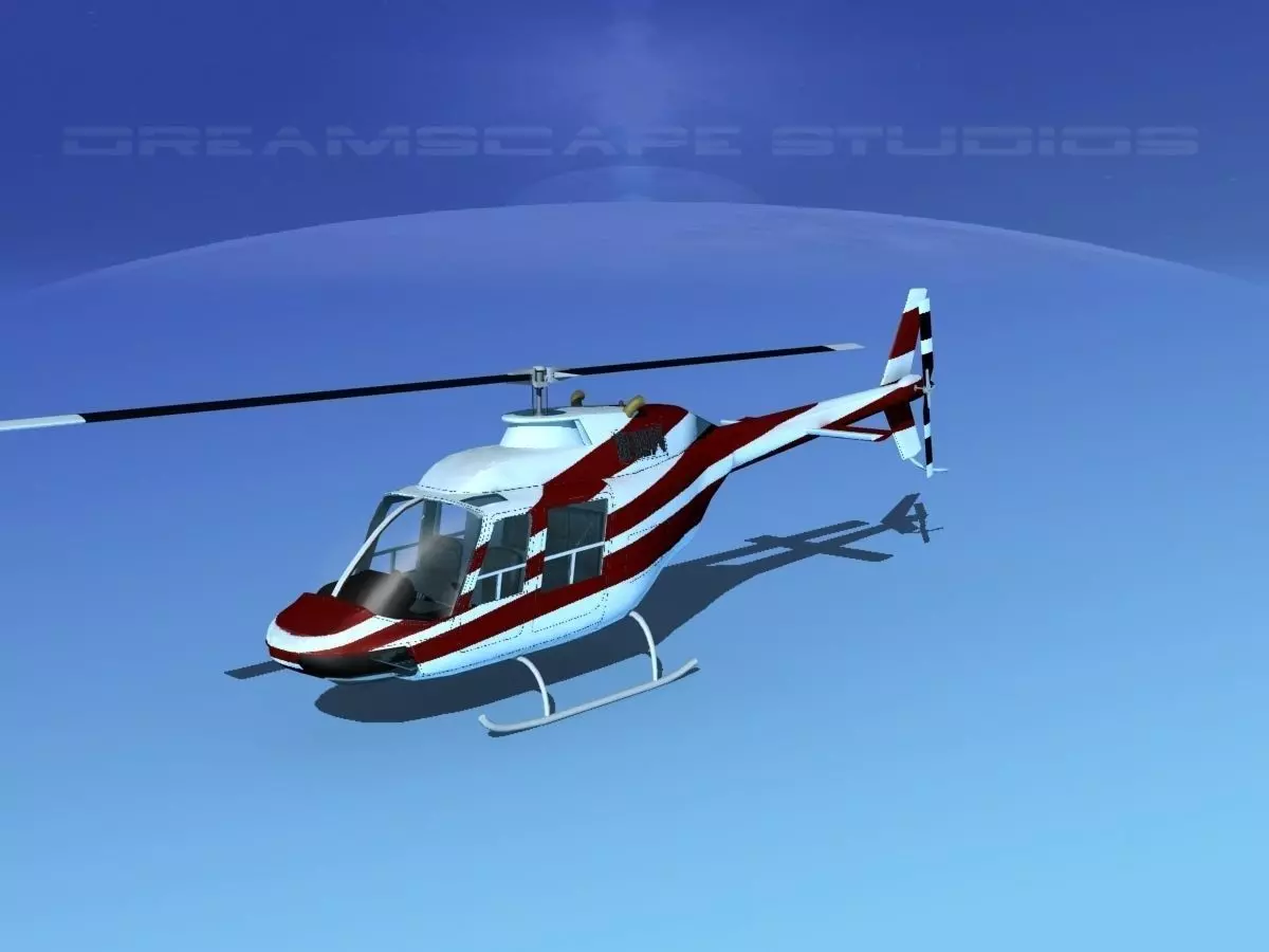 Bell 206 JetRanger V02 This model was originally built in Max 13 near to scale (within 3-4% of scale) and fully textured. It comes with all the materials and textures shown in renderings here. It is available in several formats for a wide variety of end users. This model comes with many different liveries. It is built to be used in in-flight or airport ground animations and video or simulation. It can also be used to populate an airport scene. The model has animated rotor and tail-rotor. The cockpit is semi detailed including control yoke, cyclic, rudder pedals, seating and instrument panel.