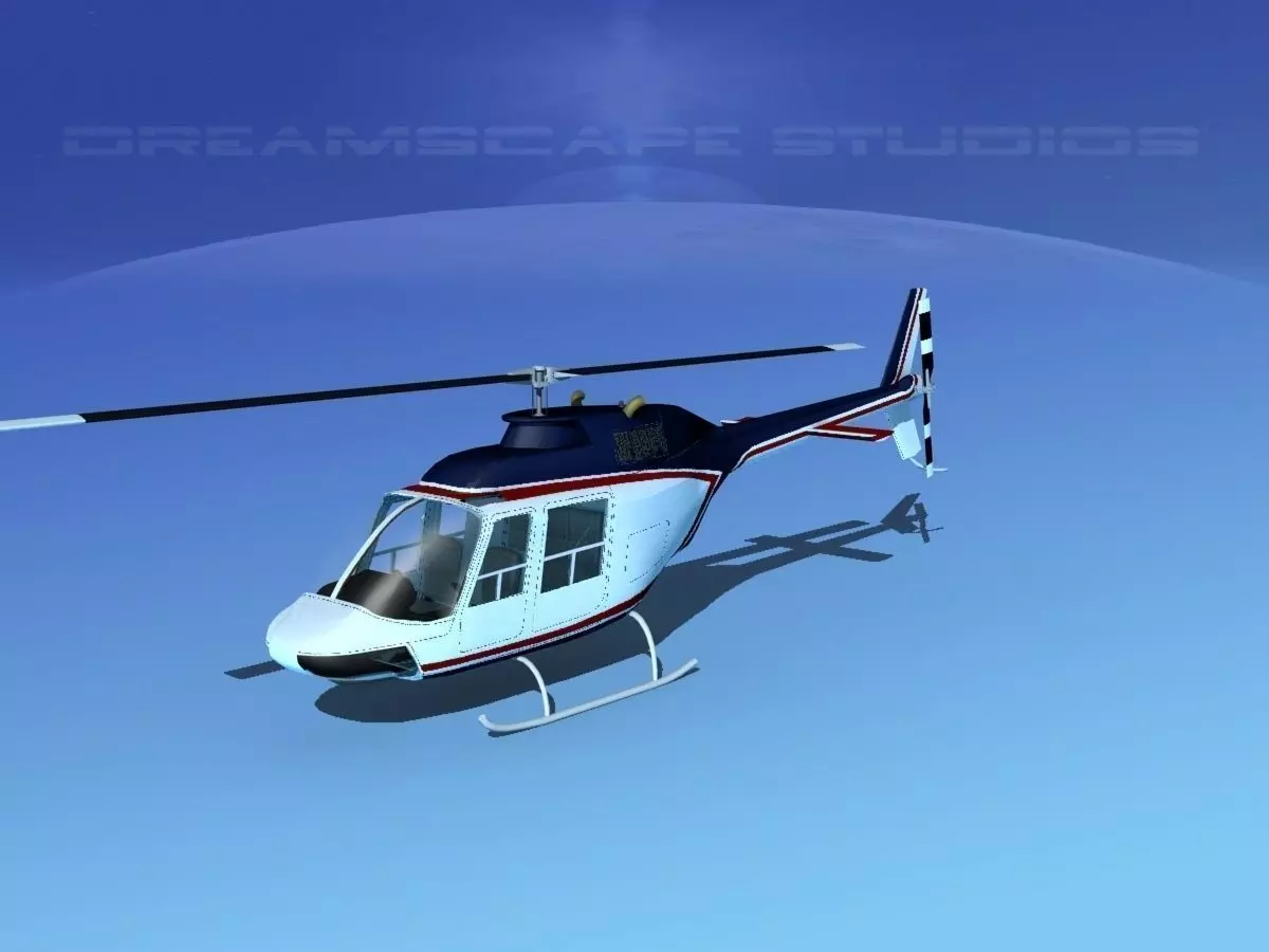Bell 206 JetRanger V03 This model was originally built in Max 13 near to scale (within 3-4% of scale) and fully textured. It comes with all the materials and textures shown in renderings here. It is available in several formats for a wide variety of end users. This model comes with many different liveries. It is built to be used in in-flight or airport ground animations and video or simulation. It can also be used to populate an airport scene. The model has animated rotor and tail-rotor. The cockpit is semi detailed including control yoke, cyclic, rudder pedals, seating and instrument panel.