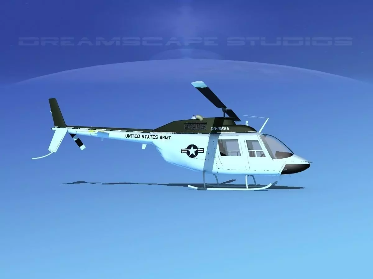 Bell OH-58B US Army 3 This model was originally built in Max 13 near to scale (within 3-4% of scale) and fully textured. It comes with all the materials and textures shown in renderings here. It is available in several formats for a wide variety of end users. This model comes with many different liveries. It is built to be used in in-flight or airport ground animations and video or simulation. It can also be used to populate an airport scene. The model has animated rotor and tail-rotor. The cockpit is semi detailed including control yoke, cyclic, rudder pedals, seating and instrument panel and armored seat panels.