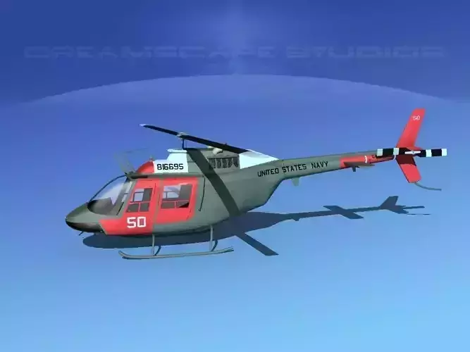 Bell OH-58B US Navy 2 This model was originally built in Max 13 near to scale (within 3-4% of scale) and fully textured. It comes with all the materials and textures shown in renderings here. It is available in several formats for a wide variety of end users. This model comes with many different liveries. It is built to be used in in-flight or airport ground animations and video or simulation. It can also be used to populate an airport scene. The model has animated rotor and tail-rotor. The cockpit is semi detailed including control yoke, cyclic, rudder pedals, seating and instrument panel and armored seat panels.