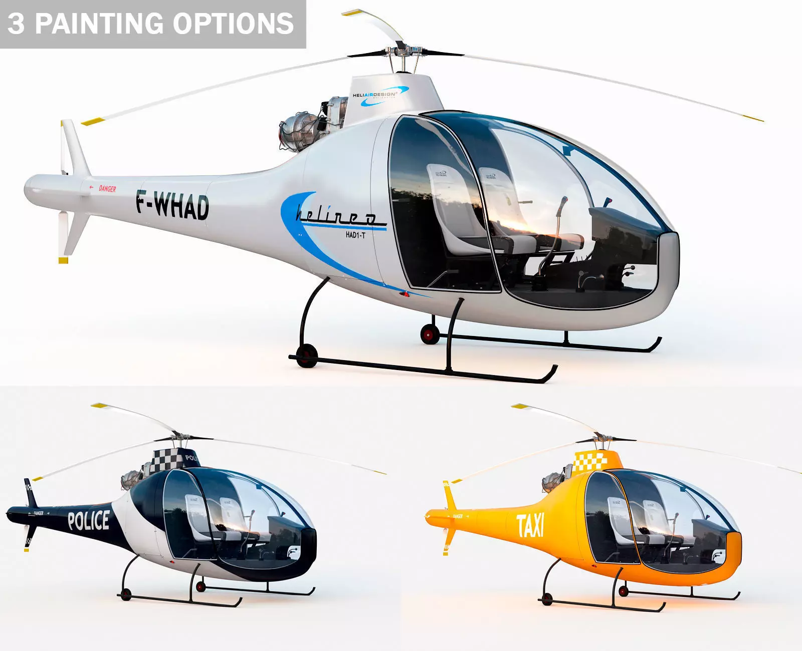 Model of the passenger helicopter HAD1-T Helineo The scene contains the HAD1-T Helineo model with texture 3 painting options and control elements for animation. The scene is configured for rendering to the coronaterer and in-ray. The archive additionally formats 3ds max 2014 and 2017 + format obj and fbx. The model is made in 1: 1 scale. The scale of the scene in millimeters. The model is located in zero coordinates. Moving an object and rotating it with the created controllers. The engine cable and some elements of the cabin are made low polygonally with baking the normal map and the model contains the minimum number of polygons. To all other elementsIt is possible to apply the turbosmooth for a smoother presentation. In total in a scene the Polis - 312810. Verts - 317758