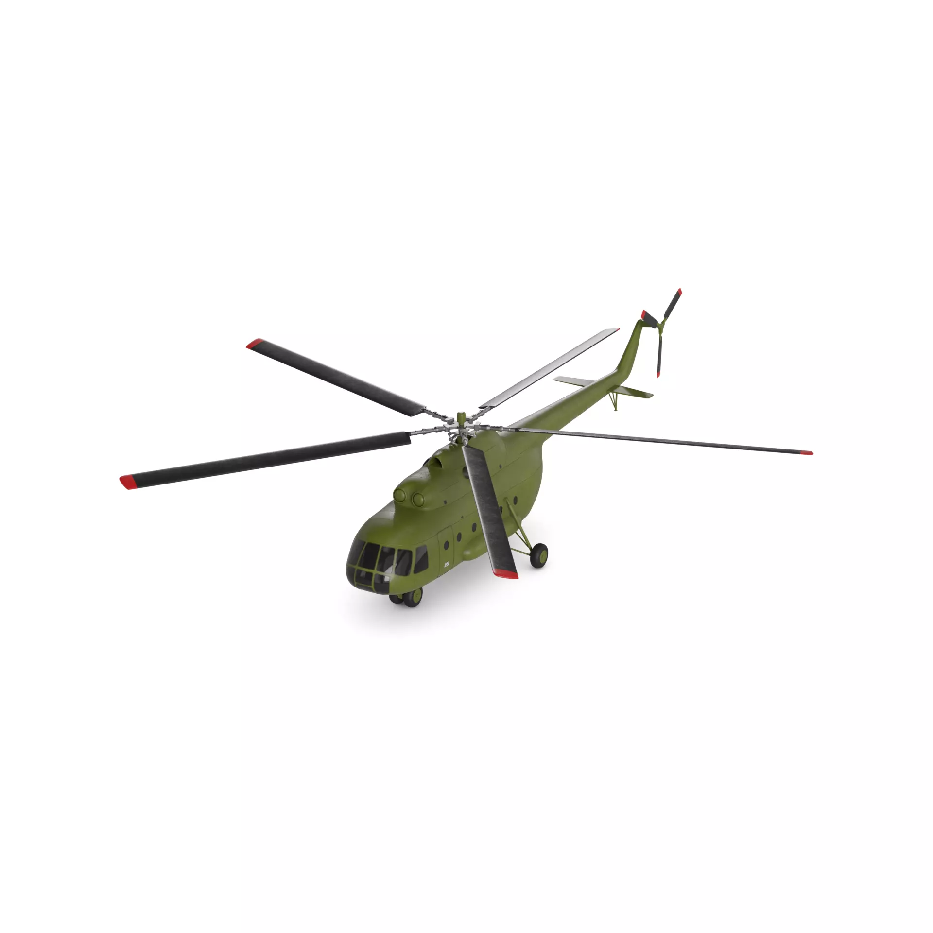 A heavy-lift helicopter with a historical design, perfect for civilian heavy-duty transportation. This helicopter boasts a unique olive green color scheme, blending seamlessly with the surrounding landscape. The body is rugged and sturdy, with large wheels for landing on rough terrain. The cockpit is spacious and equipped with advanced navigation instruments for safe and efficient flying.