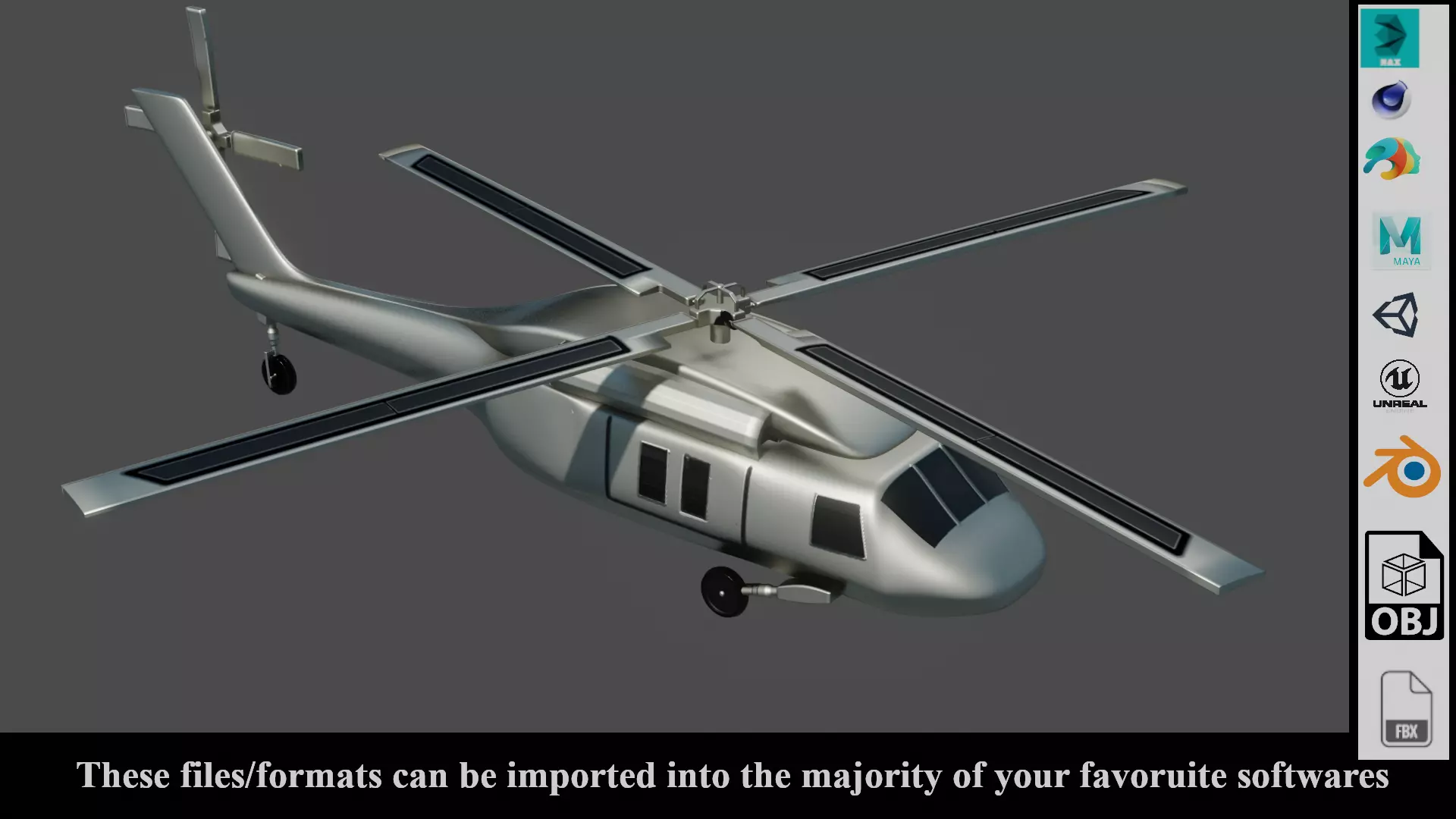 This is a 3d model of Helicopter, made with Blender 2.82.All the Previews are rendered with EEVEE render Engine.This has PBR textures. All the PBR textures are included with this.This helicopter model is ready for Game Engine.No. of Faces : 2954No. of Vertices : 3414No plugins used.