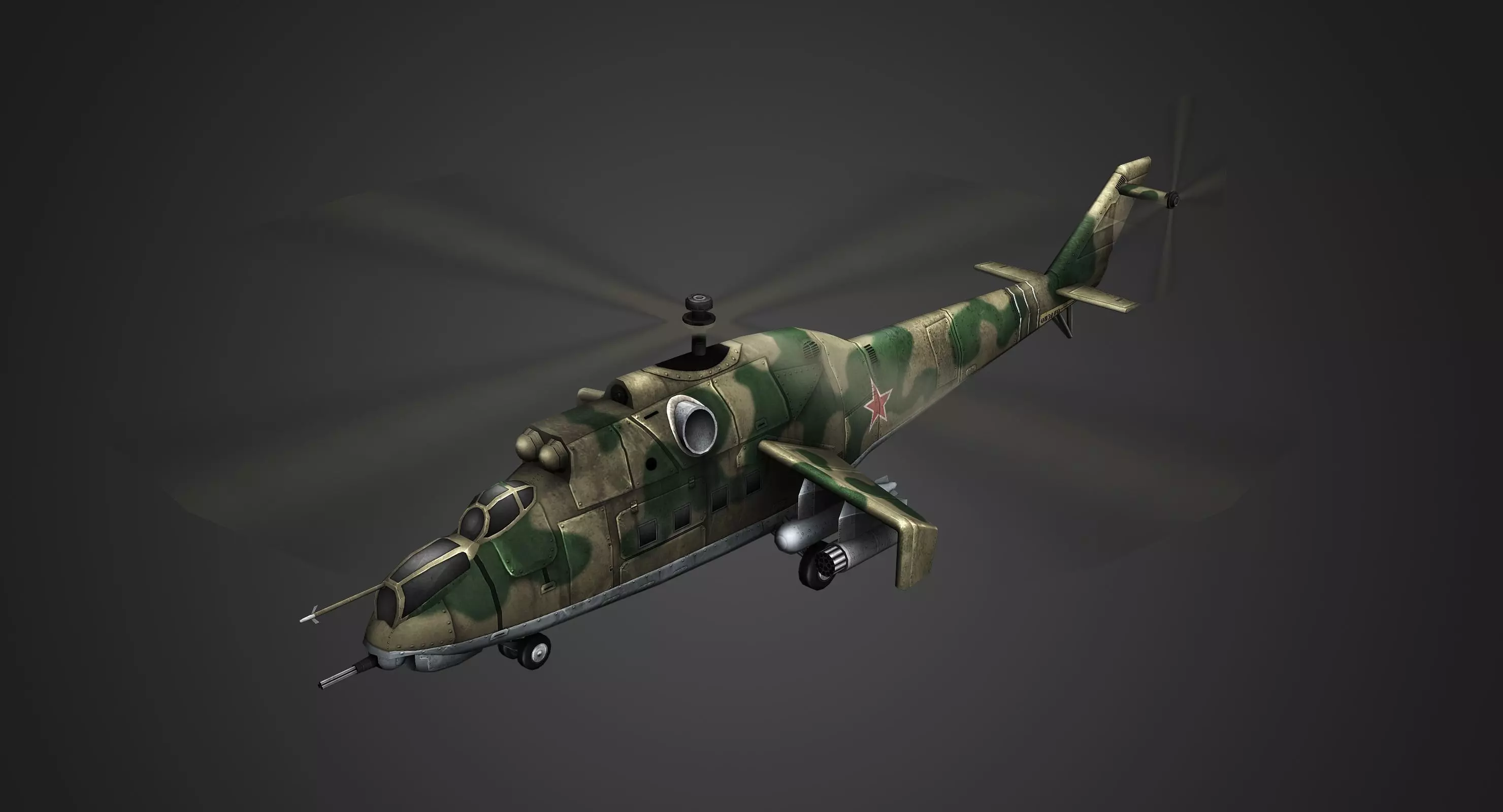 Low poly game model of a Russian Mi-24 Hind. Modeled cleanly and efficiently. Perfect for Real time strategy games or any military game mod. Included is a flying version of the helicopter with blurred blades and a stationary version with resting blades. Pivot points are set correctly for the blades to spin around the rotors.