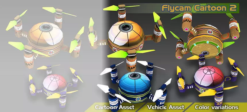 This is 2 model racing flycam cartoon 1 and 2 :New pack flying Flycam cartoon .Your game ready . Models use: - 3 color Style - Flycam cartoon are around 594 polys(1236 tris) All textures size 1024/1024 .Flycam cartoon 2 .Your game ready . Models use: - 3 color Style - Flycam cartoon are around 496 polys(1116 tris) All textures size 1024/1024 . All parts are separated, it can easily be animate rotor blade with excellent textures, it look realistic and will be a great asset for your game.