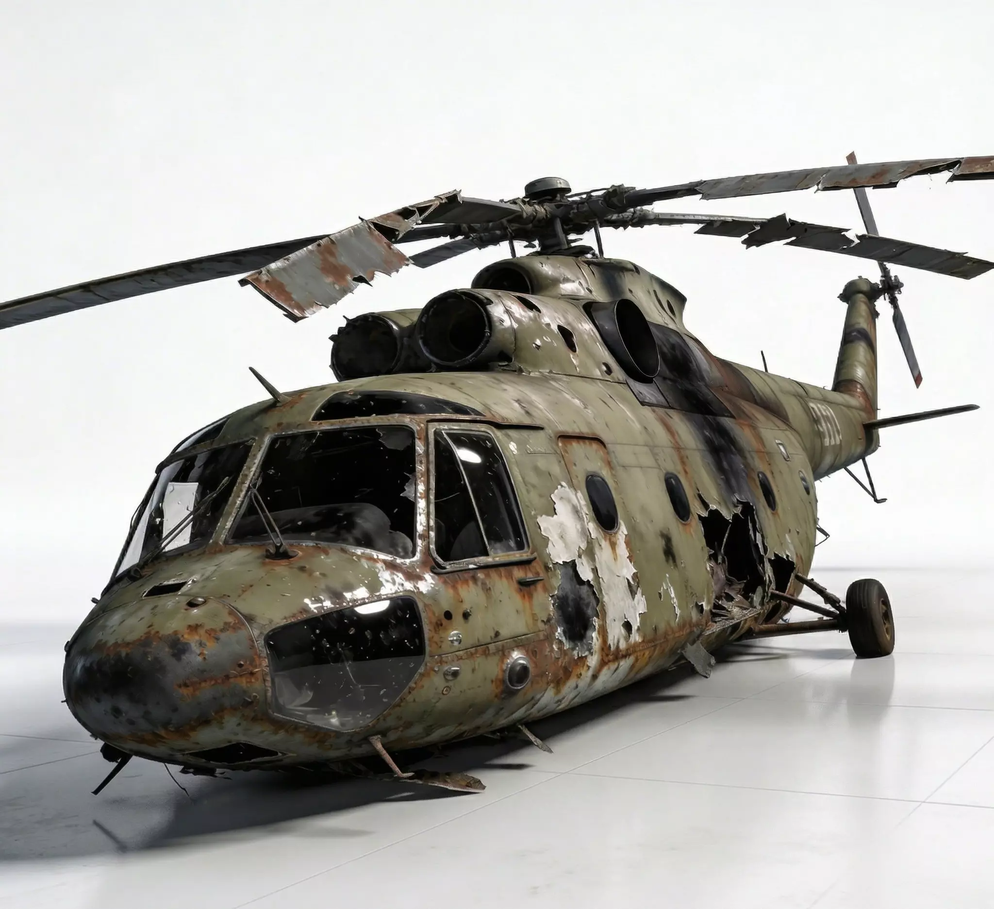 Oxidized Steel and Peeling Camouflage FinishThe helicopter features a primary body finish of heavily oxidized armored metal and tattered olive-drab camouflage, meticulously modeled with realistic surface pitting, deep iron-oxide crusting along the panel seams, and prominent scorched-earth tarnish. This professional and grounded appearance provides a clear visual story of a high-stakes combat landing followed by decades of environmental neglect, providing a sharp visual contrast against the dark internal shadows and the shattered cockpit transparencies.