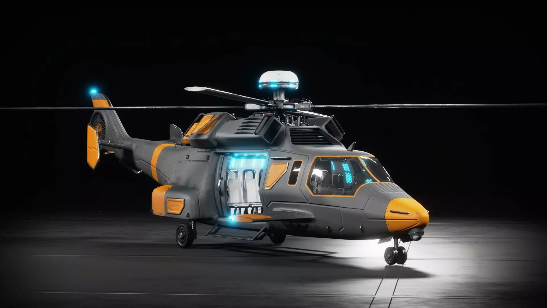 The sci-fi helicopter 3D model created in Blender and textured with Substance Painter boasts a sleek and futuristic design. The body of the helicopter is a streamlined, metallic structure with intricate details that suggest advanced technology and functionality.The 4K textures created in Substance Painter bring the sci-fi helicopter to life with realistic and detailed materials. The metallic body of the helicopter has a brushed finish with reflective highlights that give it a polished look. The canopy has a tinted glass texture that adds depth and dimension to the model.