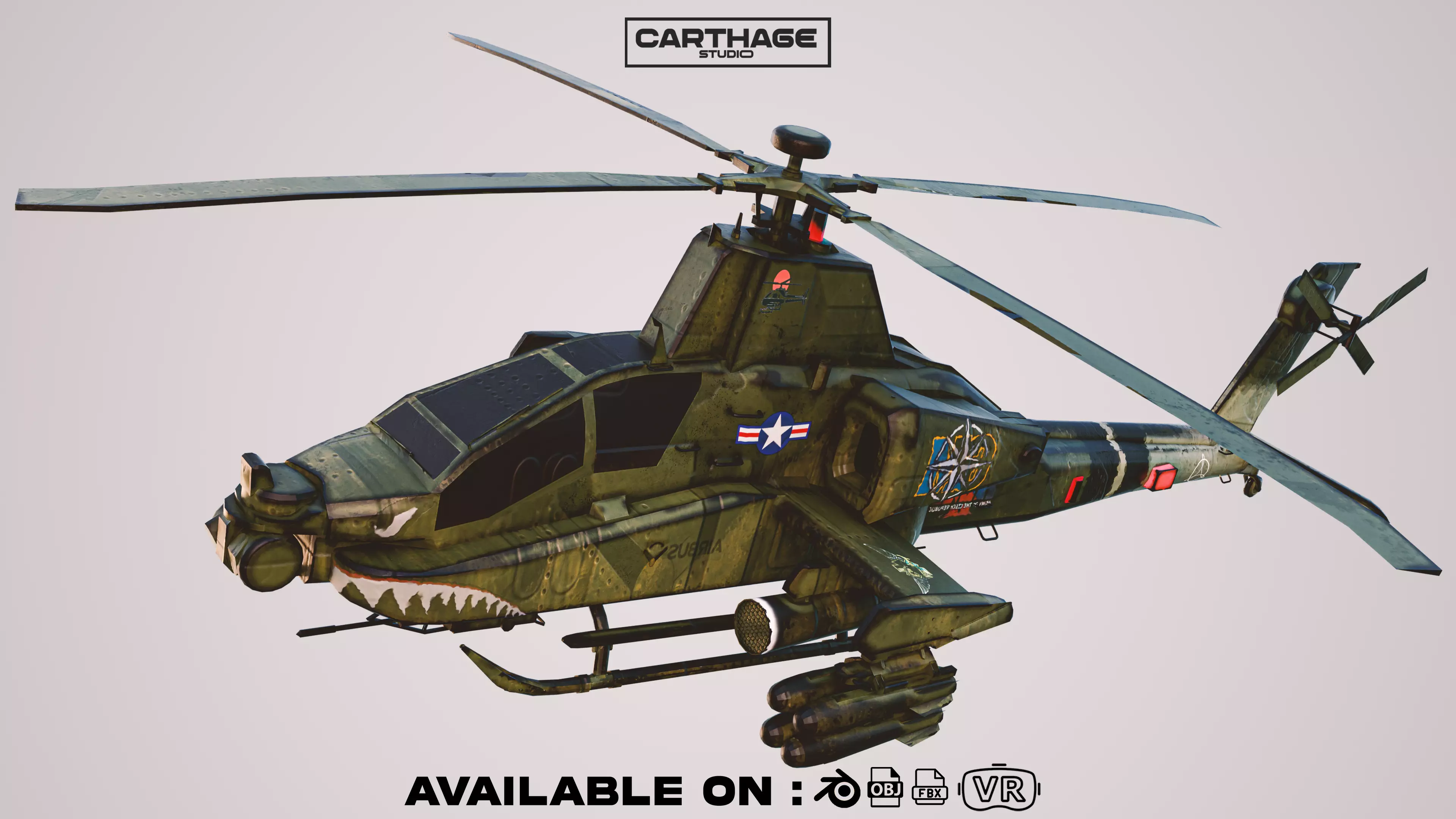 With just 15,000 vertices, a single optimized PBR material, and clean UVs, this helicopter is light on performance while retaining detailed visuals. The design includes mounted rocket pods, aerodynamic shaping, and aggressive stylings like shark teeth decals—perfect for mid- to high-action projects. this asset integrates smoothly into Unity, Unreal Engine, Blender, and more.