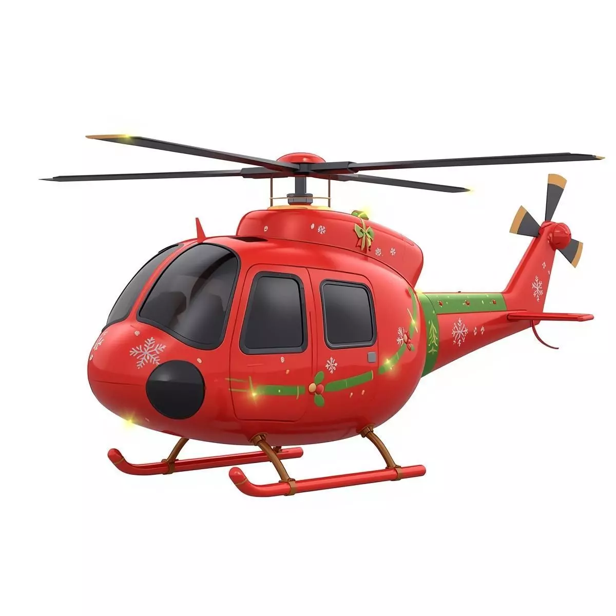 A high-quality 3D cartoon-style helicopter model featuring a vibrant festive Christmas theme. The asset is designed with a bright red body, decorated with green and gold accents, white snowflake decals, and festive garlands. Colorful Christmas lights are wrapped around the main rotor, tail rotor, and body to enhance the holiday spirit. With its smooth rounded geometry and glossy materials, this model is ideal for holiday-themed games, seasonal animations, or virtual winter environments. The helicopter features fully opaque black windows and is presented as a full-body model isolated on a clean white background.
