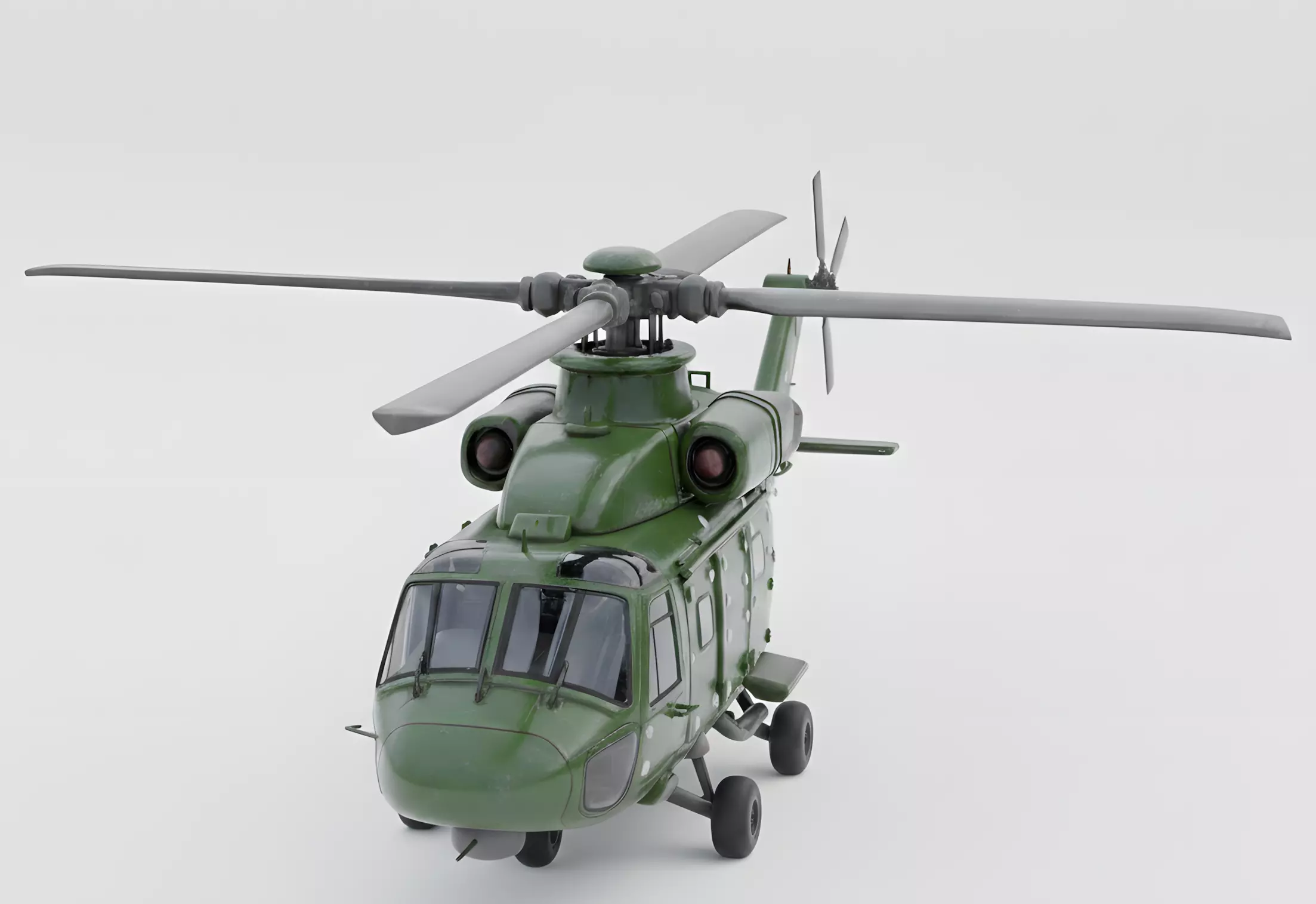 Heavy-Duty Landing GearThe helicopter is equipped with a simplified, sturdy tricycle landing gear system featuring thick rubber wheels. These elements are designed as bold, solid shapes to give the aircraft a grounded and durable stance when stationed on a carrier deck or jungle landing pad.