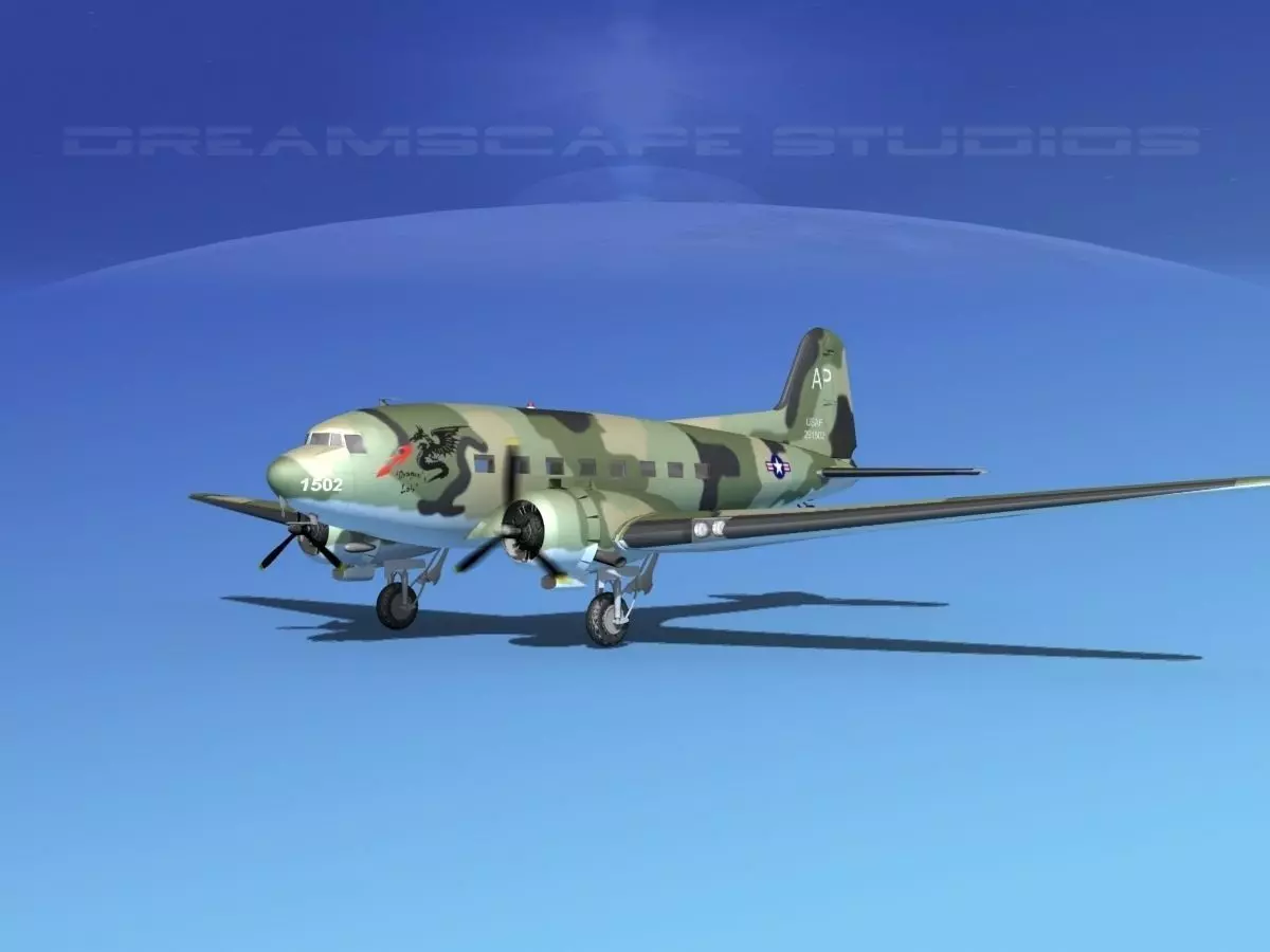 The Douglas C-47 Skytrain was also known as the Goonybird, Skytrooper and Dakota. It was developed from the Civilian Douglas DC-3. It was used extensively by the Allies during World War II to ferry cargo and personnel all over the world, to carry paratroopers, tow gliders, and for logistical and utility uses. The aircraft could carry up to 28 troops plus a pilot, co-pilot, navigator and radio operator. A cargo master was also employed in many operations. They were powered by Pratt and Whitney R1830-901C Twin Wasp 14 cylinder radial engines driving 3 bladed variable pitch propellers. The landing gear were retractable and in could operate from rough fields. They were used by every allied service during World War II. They continue to serve in many military and civilian operations around the world to this day. Recently a turboprop conversion has been accomplished to add even more lifespan to these enduring aircraft.