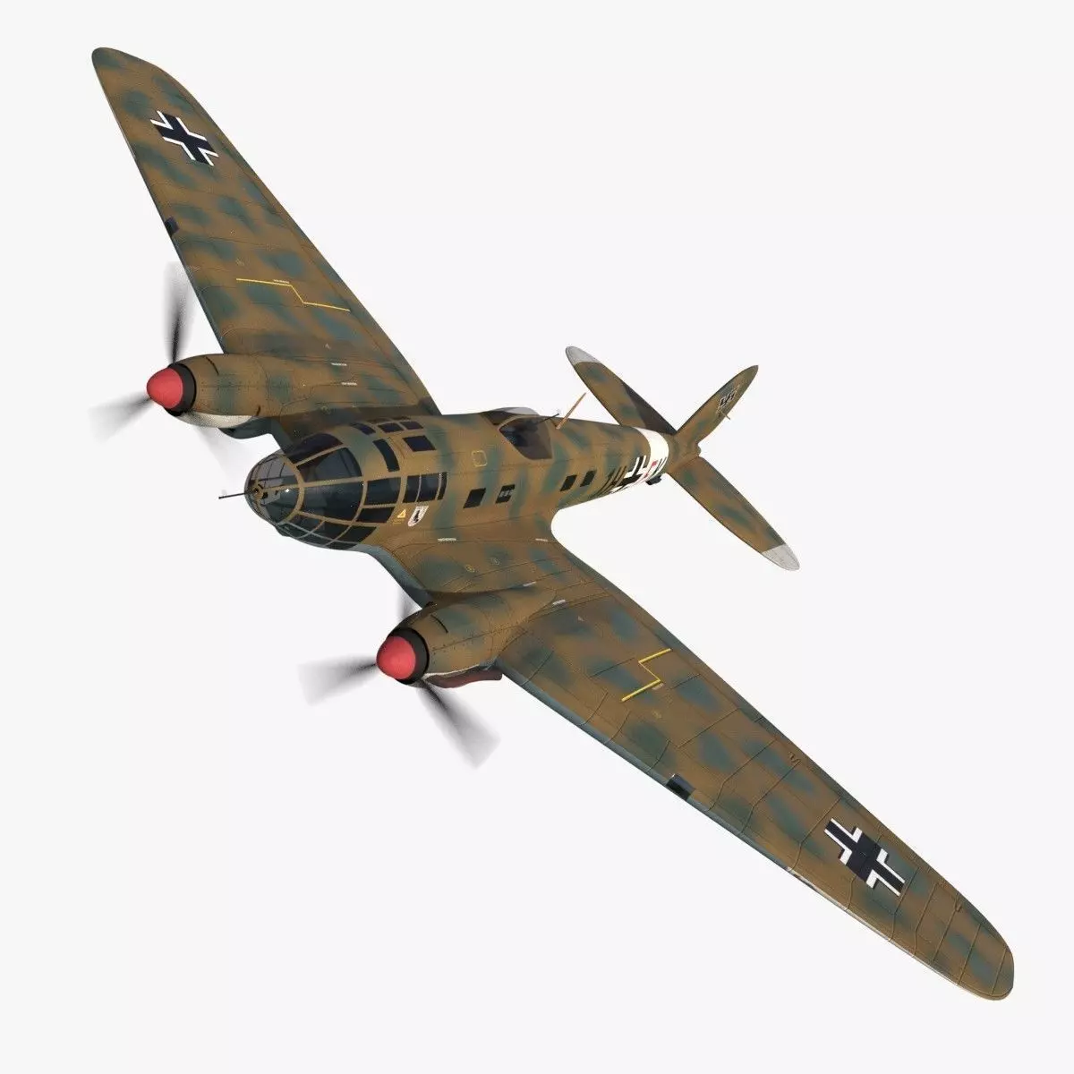 The Heinkel He.111 was a German bomber from the Luftwaffe used on many fronts in Europe during the WWII. This model is a historical re-enactment of the coded 1H+FK aircraft. This plane was integrated in the KG (Kampfgeschwader) 26 unit group. It was based in Ottana in Sardinia and it was in service in 1943. This unit flow bomber and torpedo missions over the western Mediterranean.