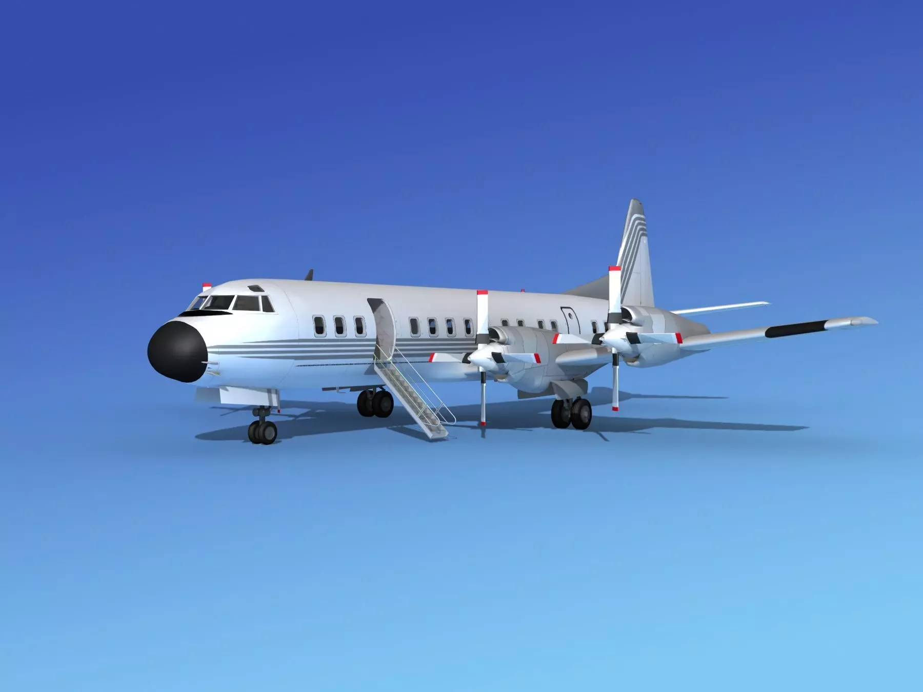 This model is built in November 2010 very near to scale and has high quality textures and materials. It comes with lots of exterior detail, animateable flaps, ailerons, rudder, elevators, and propellers. The landing gear can be retracted and landing gear doors closed. This model is a complete replacement for our earlier version of the L188 Electra. We have increased the smoothness of the faces and the poly-count, remodeled most of the aircraft from scratch, and reworked all the materials. It has interior detail including cockpit, cabin and galley. The cabin seating is a generic 66 seat arrangement. The cockpit includes the controls, instrument panels and seating as well as a flight engineers seat. Engineers panel is not detailed. Overhead panel is completed. The cabin includes the double walled fuselage, seats, with animateable drop down tables. Overhead racks are also included. Galley and lavatory bulkheads and doors are included. The interior of the model has blue seating and blue gray carpeted floor.