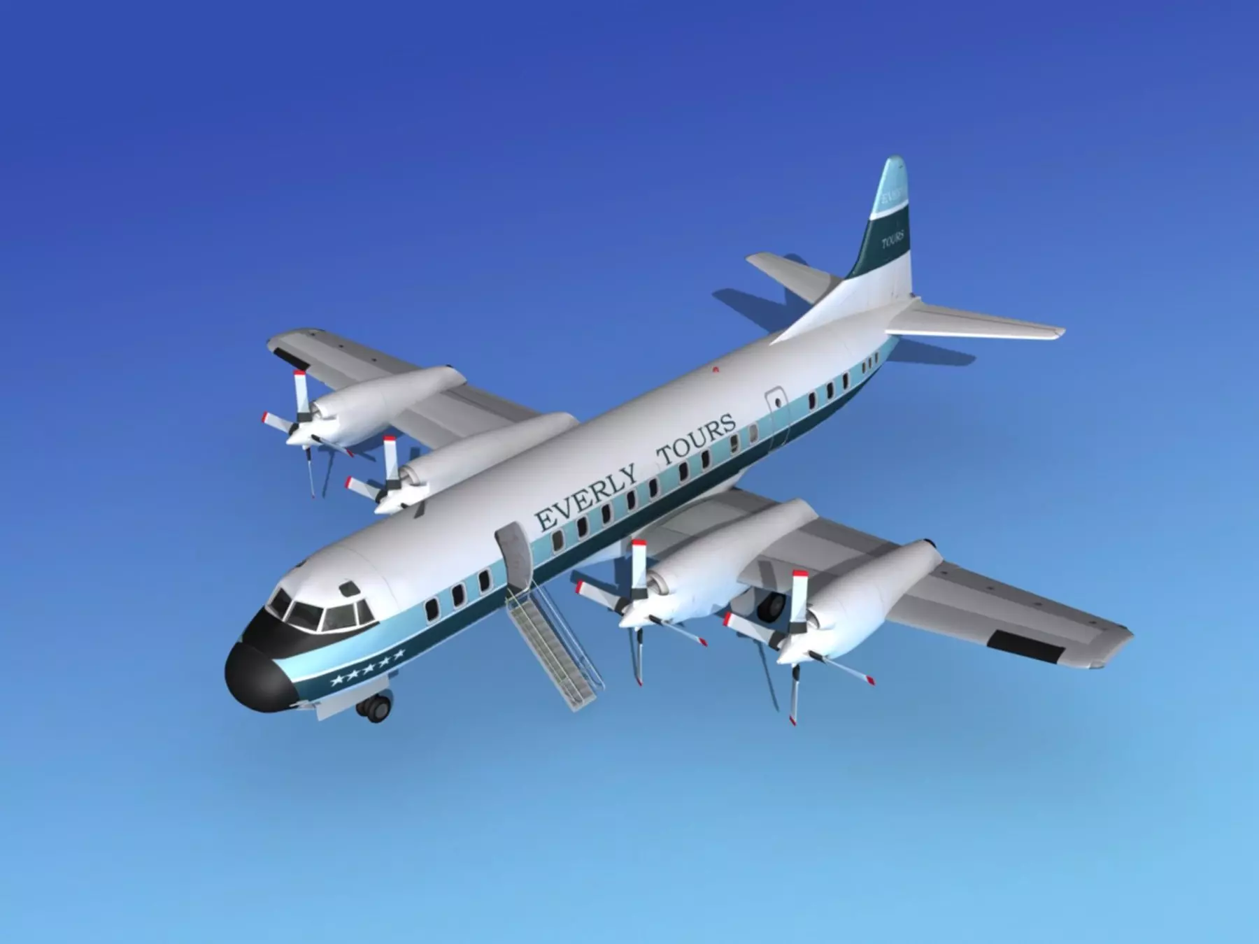 This model is built in November 2010 near to scale and fully textured. It comes with lots of exterior detail, animatable flaps, ailerons, rudder, elevators, and propellers. The landing gear can be retracted and landing gear doors closed. This model has high quality textures and materials and all are included here. This model is a complete replacement for our earlier version of the L188 Electra. We have increased the smoothness of the faces and the poly-count, remodeled most of the aircraft from scratch, and reworked all the materials. It is a complete replacement for the earlier model built in 2006. This model does have interior detail including cockpit, cabin and galley. The cabin seating is a generic 66 seat arrangement. The cockpit includes the controls, instrument panels and seating as well as a flight engineers seat. Engineers panel is not detailed. Overhead panel is completed. The cabin includes the double walled fuselage, seats, with animatable drop down tables. Overhead racks are also included. Galley and lavatory bulkheads and doors are included. The model is fully textured and detailed as shown. The interior of the model has blue seating and blue gray carpeted floor.