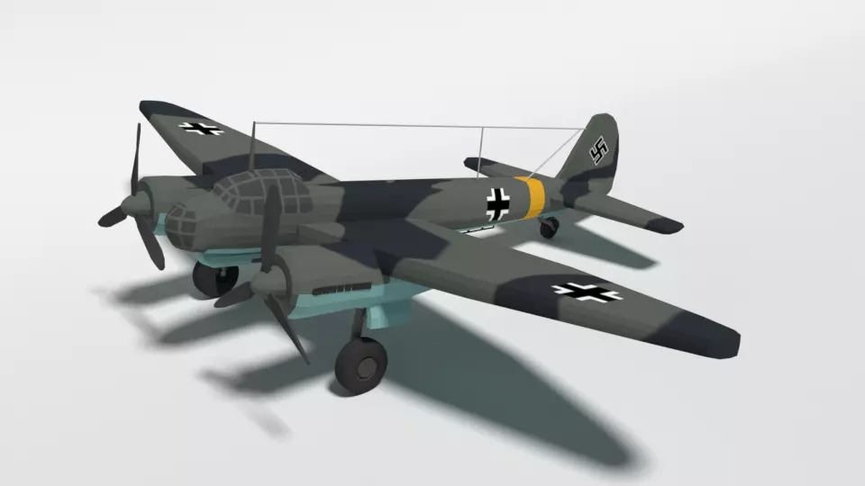This is a low poly 3d model of a Junkers Ju 88 WWII Airplane. The low poly airplane was modeled and prepared for low-poly style renderings, background, general CG visualization presented as 1 mesh with quads only.