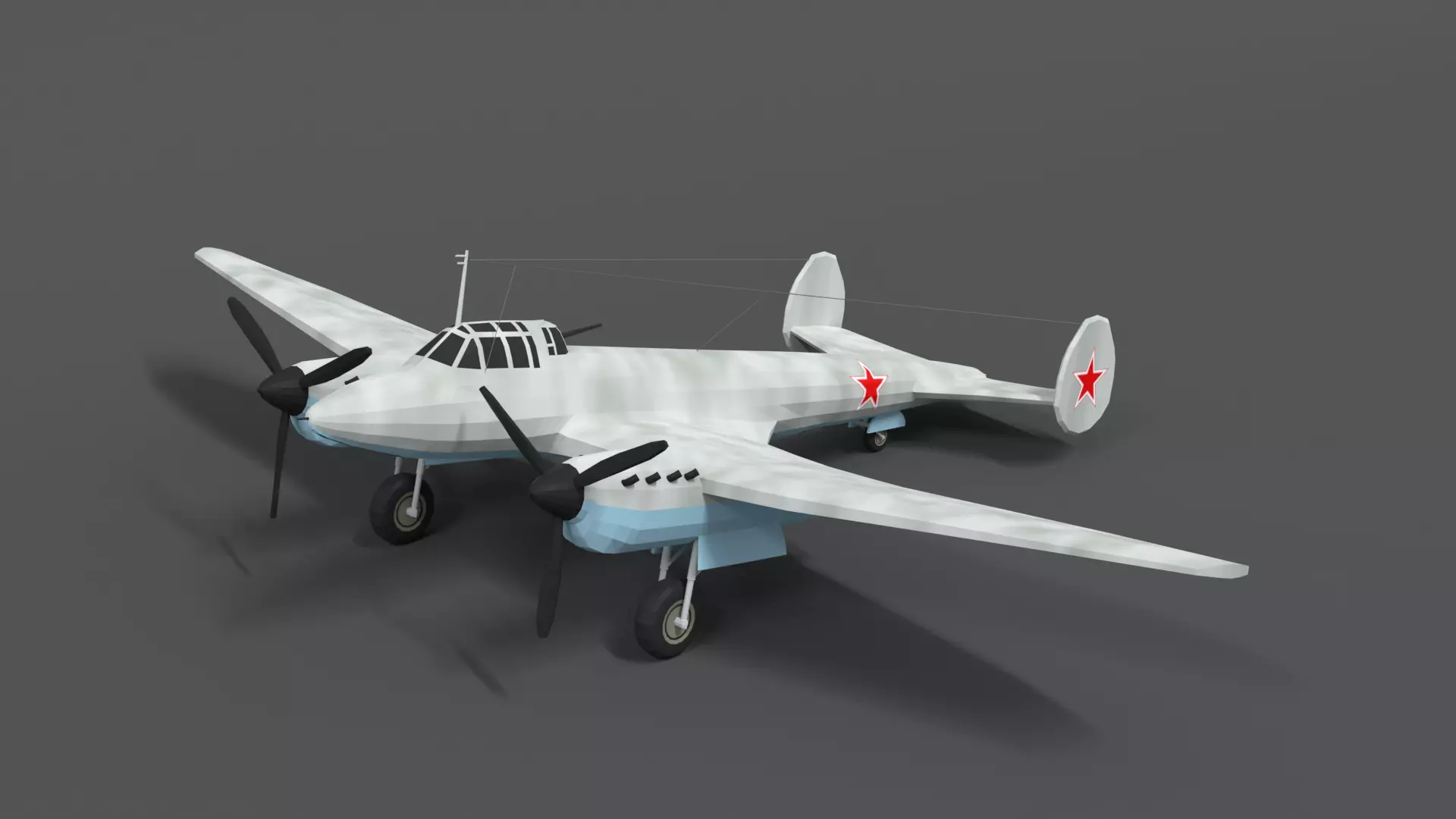 This is a low poly 3d model of a Petlyakov Pe-2 WWII Russian Airplane. The low poly airplane was modeled and prepared for low-poly style renderings, background, general CG visualization presented as 1 mesh with quads/tris.