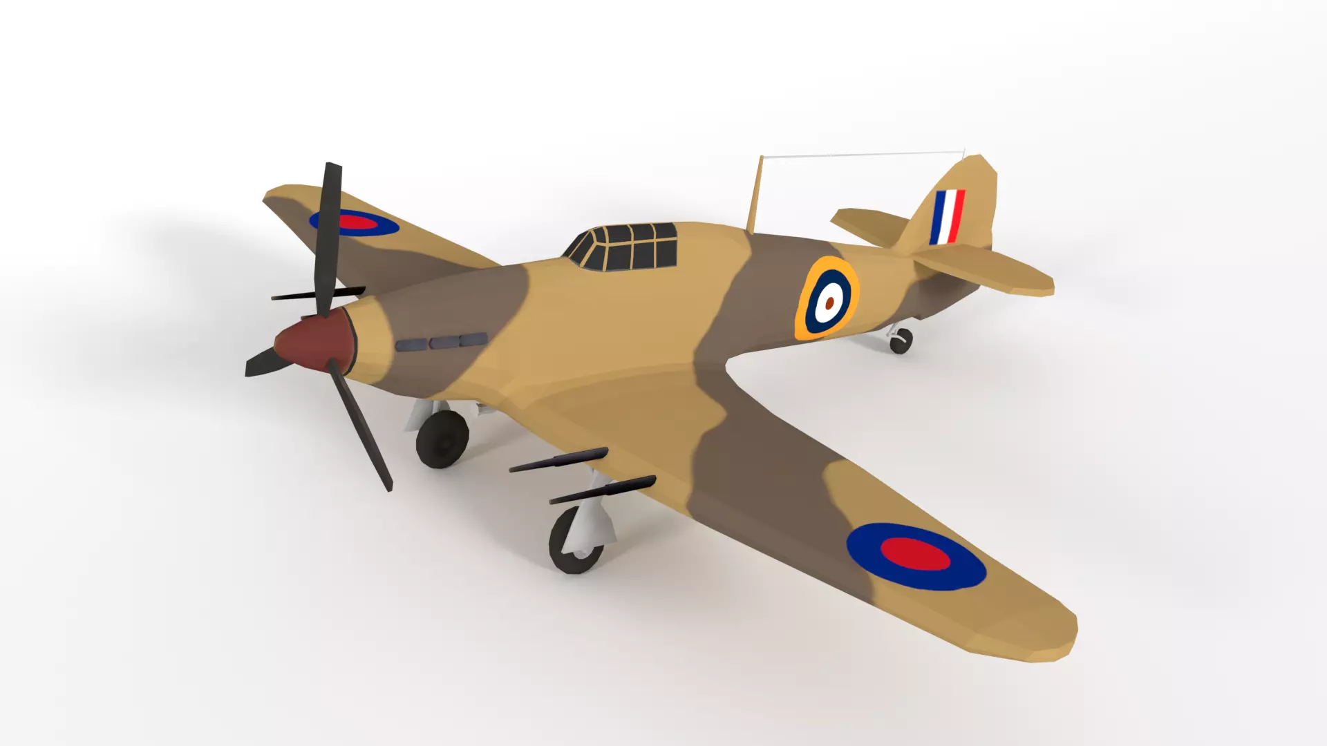 This is a low poly 3d model of a Hawker Hurricane MK IIC Airplane. The low poly Hawker Hurricane MK IIC Airplane was modeled and prepared for low-poly style renderings, background, general CG visualization.