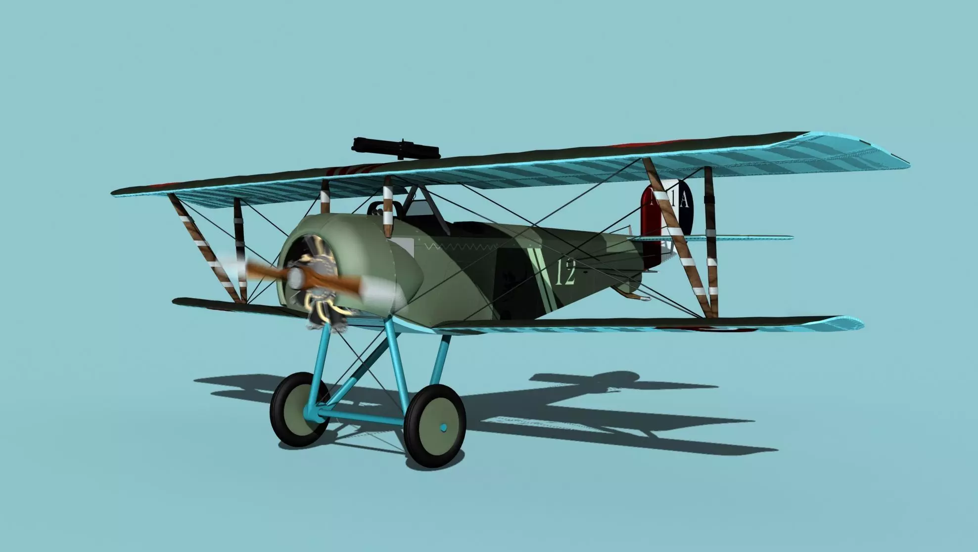 The Nieuport 11 was a biplane designed and produced in 1916 and 1917. It had an air cooled rotary 7 cylinder engine driving a two blade fixed pitch wooden propeller. It was s good fighter plane when it came out but was obsolete fairly quickly as the advancements in military planes came fast during the war. It was flown by France and the first plane used by the United States Army Expeditionary Forces. It also was the first airplane in the military to carry and fire rockets at ground targets. 3 unguided rockets could be attached to the struts between each wing outboard and then fired at ground targets electrically.