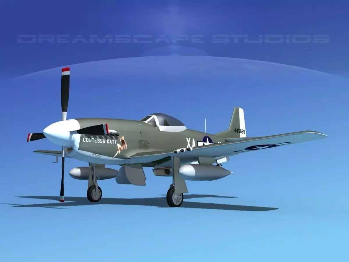 This Mustang model was originally developed for the Discovery Channel. It is built very near to scale and is fully textured. This model is detailed to include cockpit. The engine, cowlings, mounts, seat and radio equipment are modeled. Controls, instrument panels and many cranks and switches are modeled in the cockpit. Many features are animateable including ailerons, flaps, rudder, elevators, main and tail landing gear and doors, propeller, and the cockpit canopy opens.