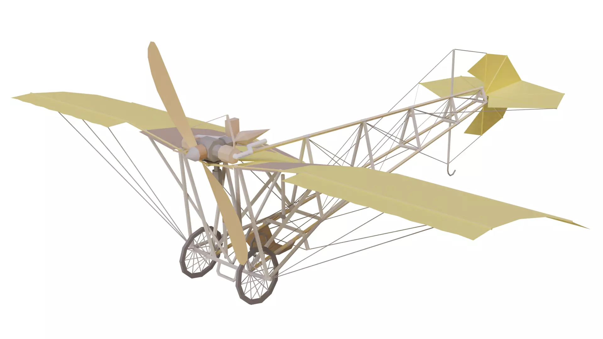 Santos-Dumont No. 19, which was built to attempt to win the Grand Prix d'Aviation offered for a one kilometre closed-circuit flight. Powered by a 15 kW (20 hp) air-cooled Dutheil & Chalmers flat-twin engine mounted on the leading edge of the wing, it had a wingspan of 5.1 m. (16 ft 9 in), was 8 m (26 ft 3 in) long and weighed only 56 kg (123 lb) including fuel. It had a pair of hexagonal rudders below the wing on either side of the pilot, a forward mounted hexagonal elevator in front of the pilot and a cruciform tail which, like the boxkite-style canard surfaces on the earlier 14-bis biplane of 1906, pivoted on a universal joint to function both as elevator and rudder mounted at the end of a substantial single boom. There was no provision for lateral control. The undercarriage consisted of a pair of wheels in front of the pilot and a third behind, supplemented by a tailskid.