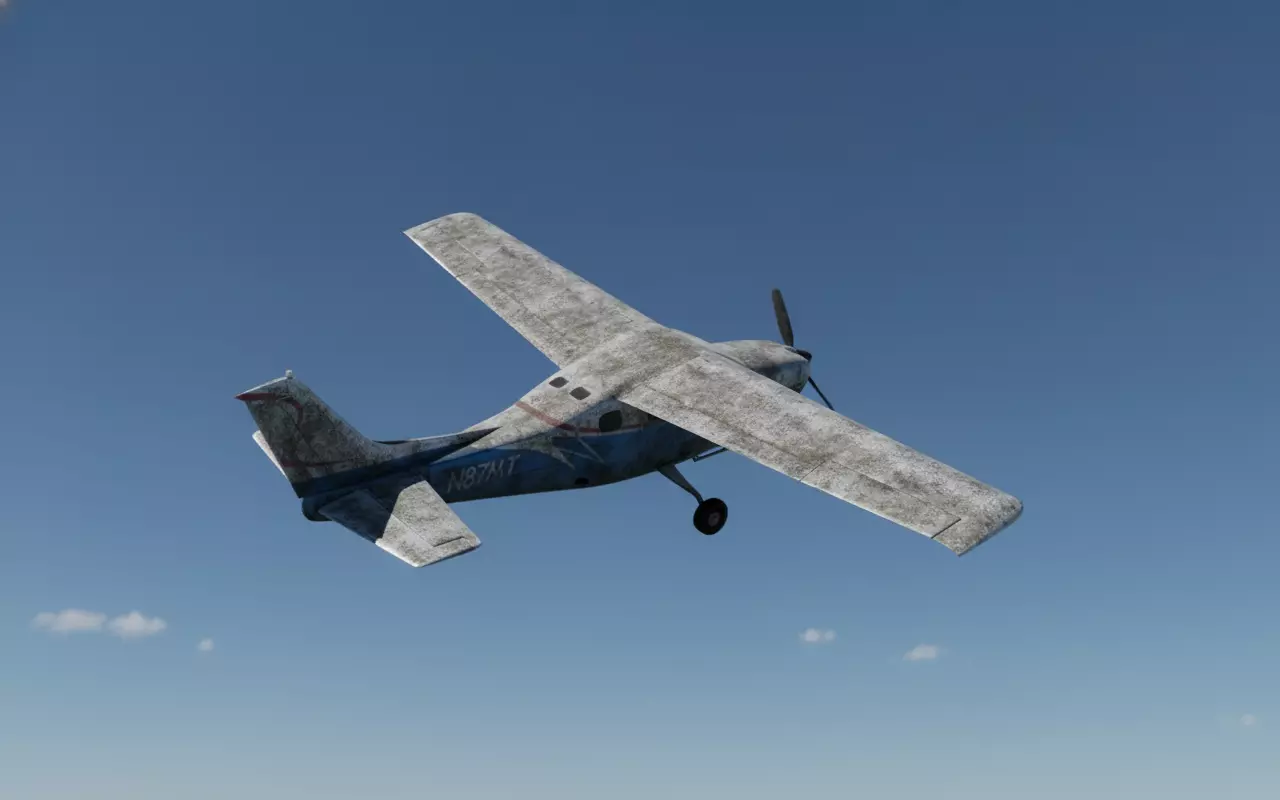Detailed exterior with aged paint, rust streaks, dirt, and thick snow/frost coverage on wings, fuselage, tail, and propellerRegistration number N87MT on the tail for added realismFixed tricycle landing gear in down position with snow buildupClassic high-wing design with struts, four-seat cabin windows, and single propellerClean topology optimized for both close-up renders and real-time performance
