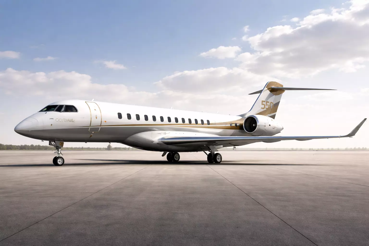 The model represents a high-end private jet built for intercontinental flights, making it suitable for corporate aviation scenes and luxury airport environments.