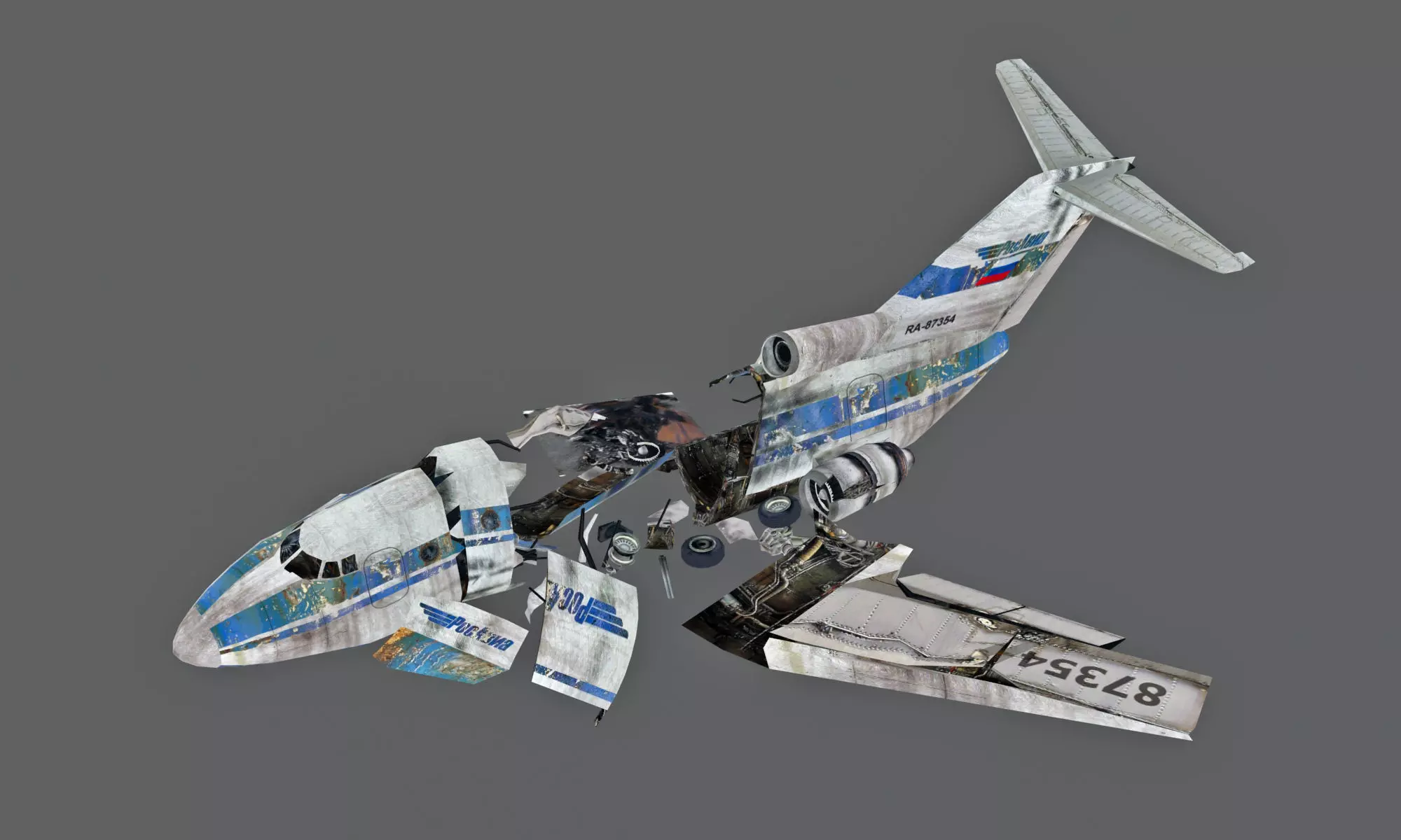 Realistic crash-damaged aircraft with torn fuselage, separated parts, exposed internal systems, and aged detailing