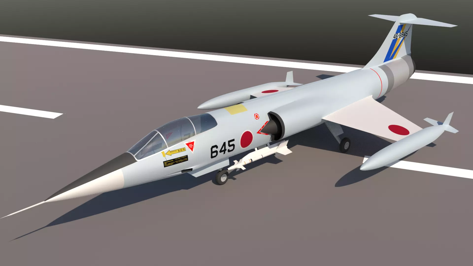 This model also features the wingtip fuel tanks, rigged control surfaces, rigged landing gear, AIM-9 Sidewinder air-to-air missiles (on the pylons under the fuselage) and decals of the F-104J. This model is rigged and animated.