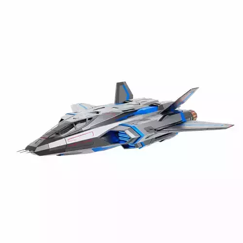 This is a high-fidelity 3D model of a futuristic stealth interceptor, featuring an advanced aerodynamic design suitable for both atmospheric and near-orbit operations. The aircraft is rendered with a metallic gray fuselage accented by vibrant blue and red racing stripes, giving it a distinct, high-performance aesthetic. Key design elements include a sharp, angular cockpit, twin rear engines with glowing copper-toned thrusters, and a complex wing configuration designed for superior maneuverability. The model is shown from a top-down perspective, highlighting its symmetrical, aggressive profile and detailed paneling. This asset is ideal for science fiction game environments, aerospace visualizations, or cinematic projects requiring a cutting-edge combat aircraft.