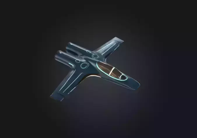 Twin engine pods are integrated directly into the aircraft’s upper frame, forming a unified shape that blends propulsion and bodywork in a single continuous flow. Subtle circular surface markings and illuminated teal accents enrich the design with a sci-fi aesthetic while maintaining the low poly charm. The cockpit canopy, tinted and reflective, sits neatly at the front—a soft oval-shaped window that maintains readability even from a distance, making it ideal for games, animations, or simulations where clarity and stylization are key.
