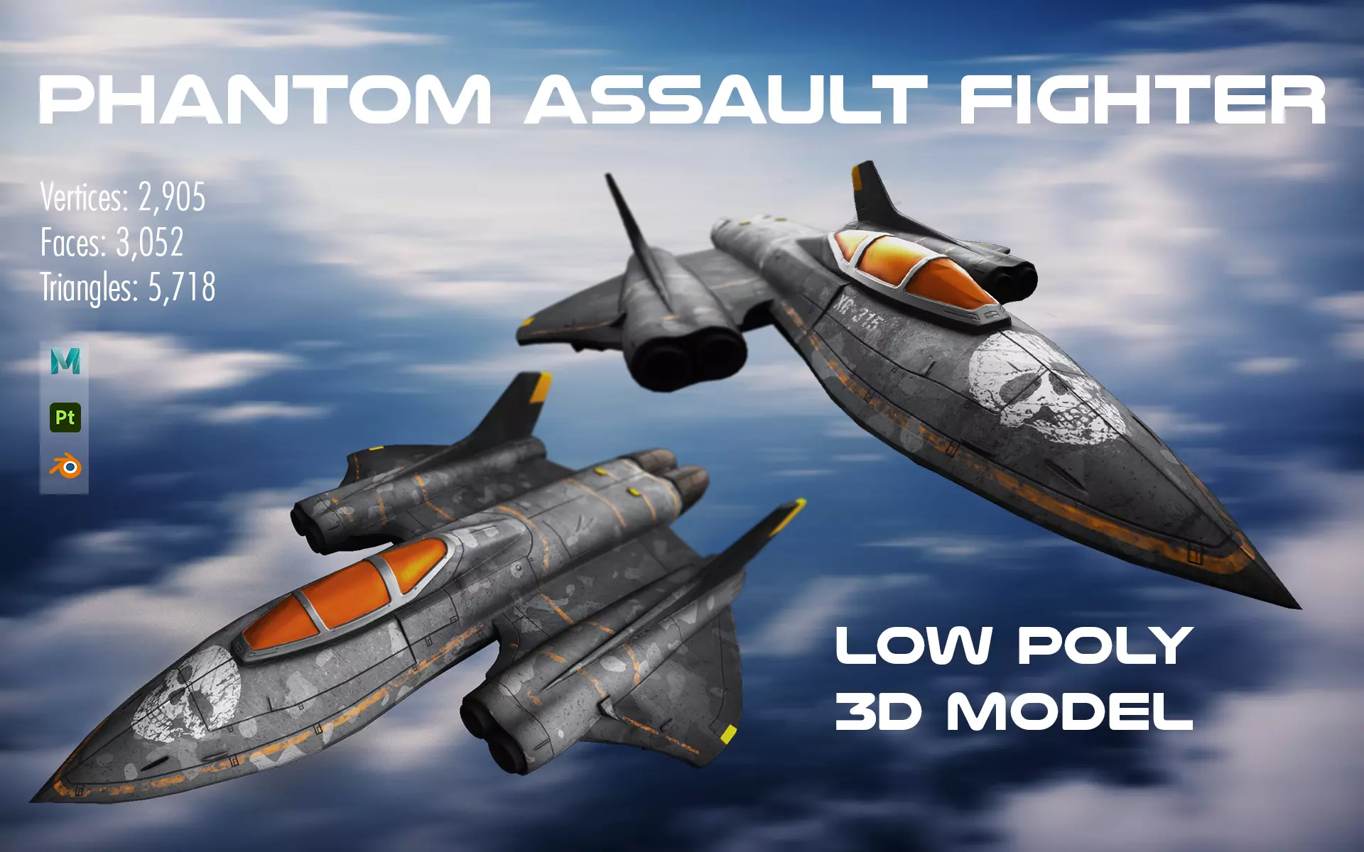 The Phantom Assault Fighter is a high-quality futuristic stealth aircraft designed for games, cinematics, and sci-fi environments. This model features a sleek aerodynamic silhouette with detailed panel lines, realistic surface wear, and military-inspired markings that give the aircraft a battle-tested appearance.The design combines modern stealth fighter aesthetics with futuristic elements, making it perfect for sci-fi military scenes, cinematic renders, and real-time applications.The model is optimized with clean topology and efficient geometry, allowing it to perform well in both real-time engines and high-quality rendering pipelines.