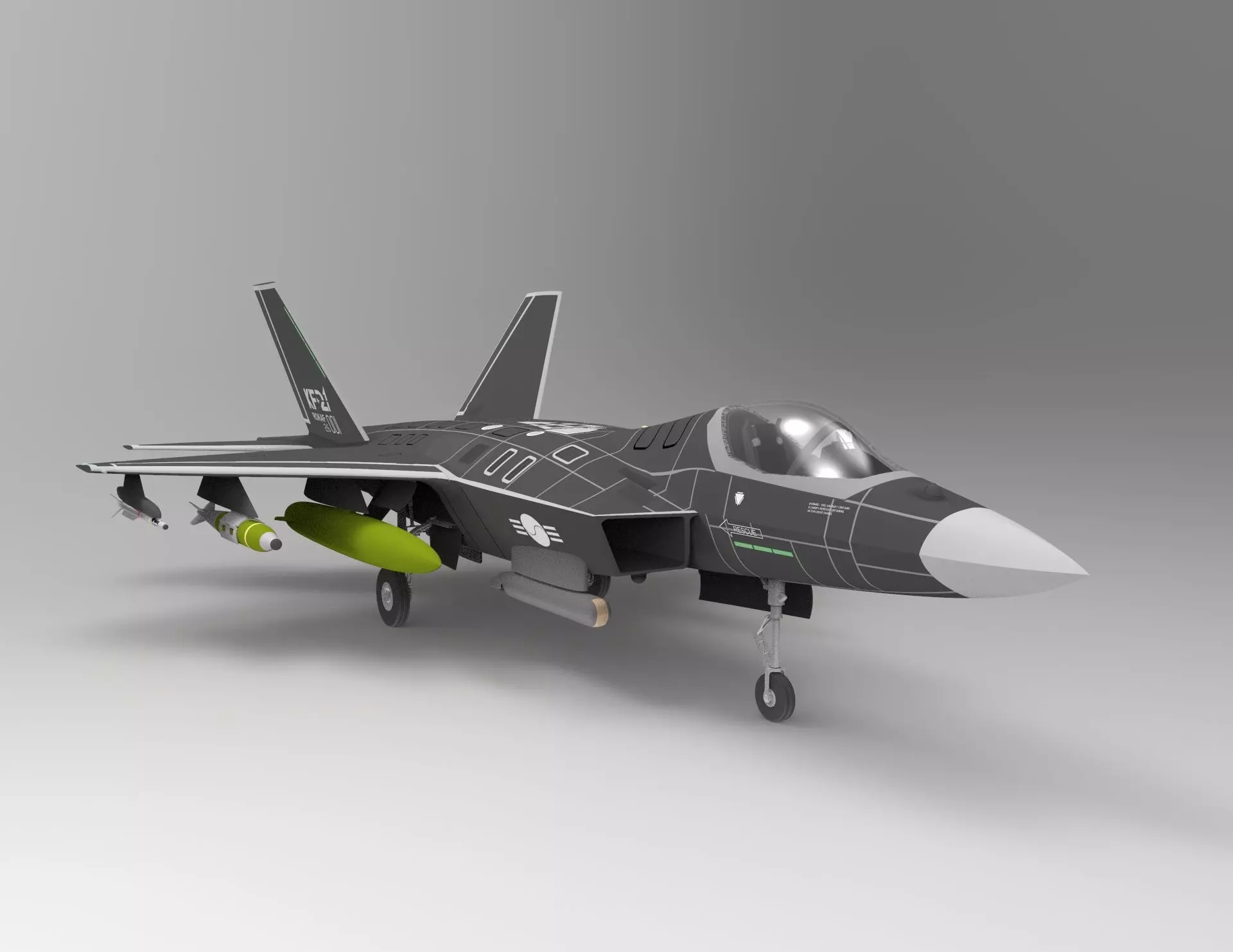 This fighter jet 3D model accurately showcases the cutting-edge design of modern aviation industry. Its overall silhouette is imbued with a sharp, technological aesthetic, featuring a seamlessly integrated streamlined fuselage and diamond-shaped wings that significantly enhance stealth capabilities and high-speed maneuverability. The model meticulously captures every detail of the airframe, including a low-observable matte gray coating that effectively reduces visual and radar detection. The faintly visible seams of the internal weapons bay doors on the ventral side highlight its stealth-oriented design for carrying ordnance. The distinctive one-piece bubble canopy provides an unparalleled panoramic field of view, while the distributed optical apertures on the dorsal surface and wing roots, combined with the serrated engine nozzles, collectively form the key sensory and propulsion features that ensure its dominance in future warfare. The clean and crisp lines of the entire aircraft perfectly unite form and function.