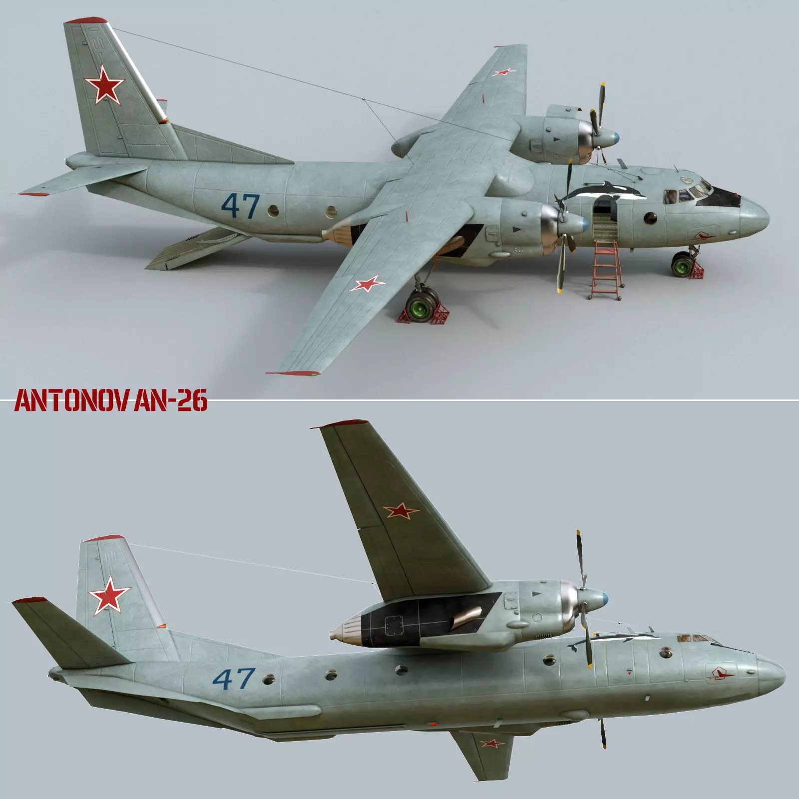 Antonov An-26. In the package: full exterior and interior, parking equipment, full crew (pilot, co-pilot, bortradist, navigator). Main file - 3ds Max 2013, fbx+fbm, obj. Materials and textures, rendering Corona 1.5 (PBR is disabled), PaintKit for repainting the exterior in PSD format. All objects in max-files is divided by layers. Animation: range 0 - 100 frames. Animated: landing gears and landing gears covers, landing light, cover of left engine, doors (ext/int), cargo doors and ramp (see attached renders - it shows key animation). Textures are 2K, UVW wrap, in Russian AF NAVI (Black Sea Fleet) livery. Materials only Corona!PS. One of the most common medium military transports in eastern Europe, both in the former Soviet Union and from north to south from Poland to Serbia.