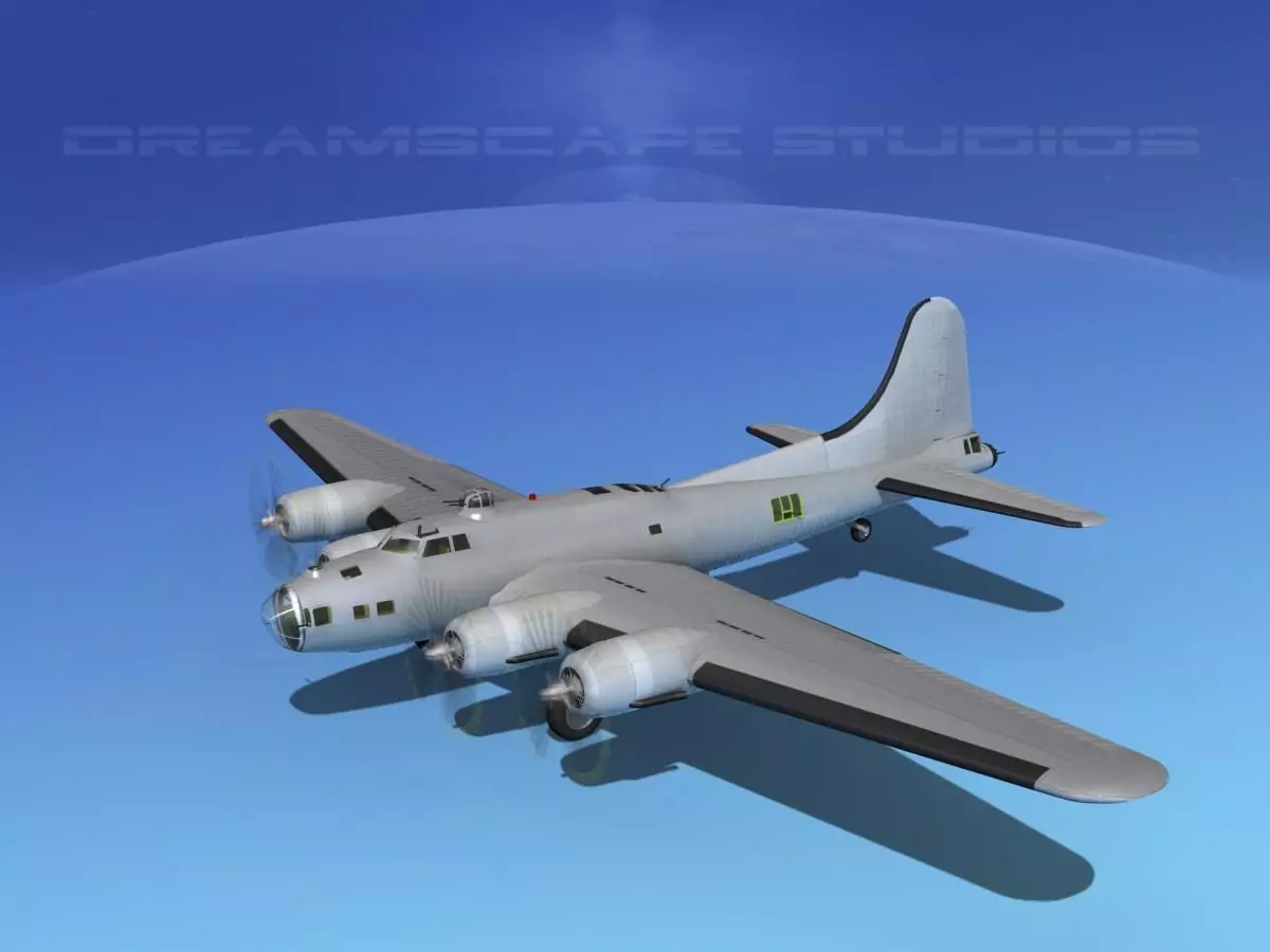 B-17 is built very near to scale and is fully textured. It has animateable flaps, ailerons, landing gear, landing gear doors, elevators, rudder, bomb bay doors and turret guns. Propellers are animated. HP version has a fairly detailed cockpit, radio room, bomb bay, navigator station and waist gunners station. It also has bombs. Both model versions have detailed landing gear. HP version also has detailed engines. Models are available in many formats.